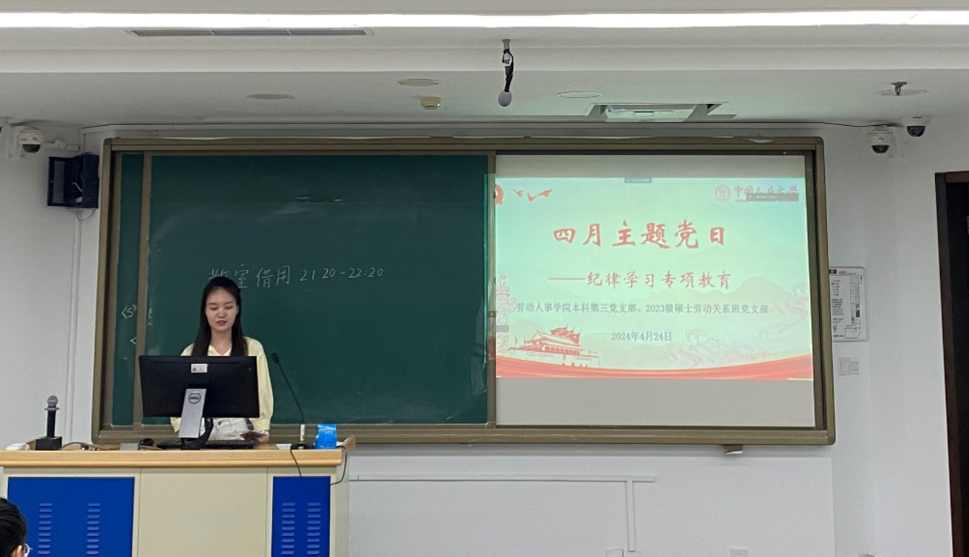 在本次主题党日活动中,本科第三党支部和2023级硕士劳动关系班党支部共同参与学习、研讨分享和知识问答等丰富多样的主题党日学习环节,加强了支部成员间的沟通,进一步加深了与会同志对党纪党规的认识,使其明白纪律是管党治党的戒尺,也是党员约束自身行为的标准和遵循。党员需要强化党员纪律意识,加强自我约束,提高免疫能力,增强政治定力、纪律定力、道德定力、抵腐定力,树立正确的价值观、世界观、从政观,将党规党纪内化于心、外化于行,推动从严治党纵深发展。