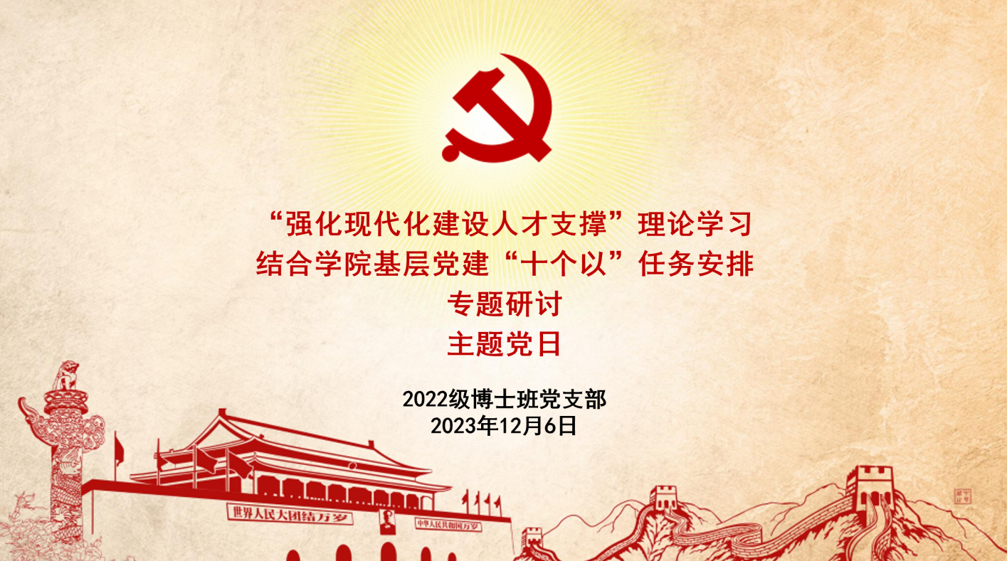 为深入学习贯彻习近平新时代中国特色社会主义思想和党的二十大精神,深刻领会党的二十大报告中“强化现代化建设人才支撑”重大意义与精髓要义,提高党员思想政治素养、理论学习深度与学术实践水平。12月6日,必威西汉姆官网平台2022级博士班党支部组织开展了“强化现代化建设人才支撑理论学习公司基层党建‘十个以’任务安排”主题党日活动,活动分两阶段进行。公司党委书记唐鑛作为2022级博士班党支部理论导师参加了本次活动。