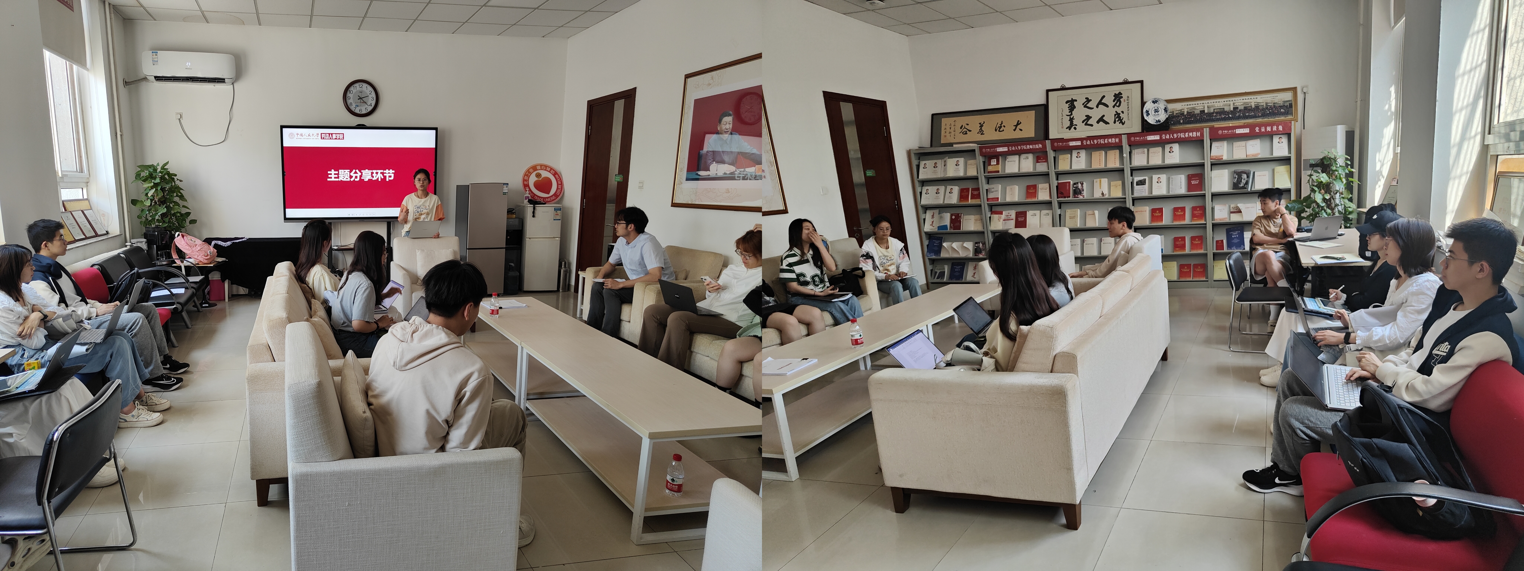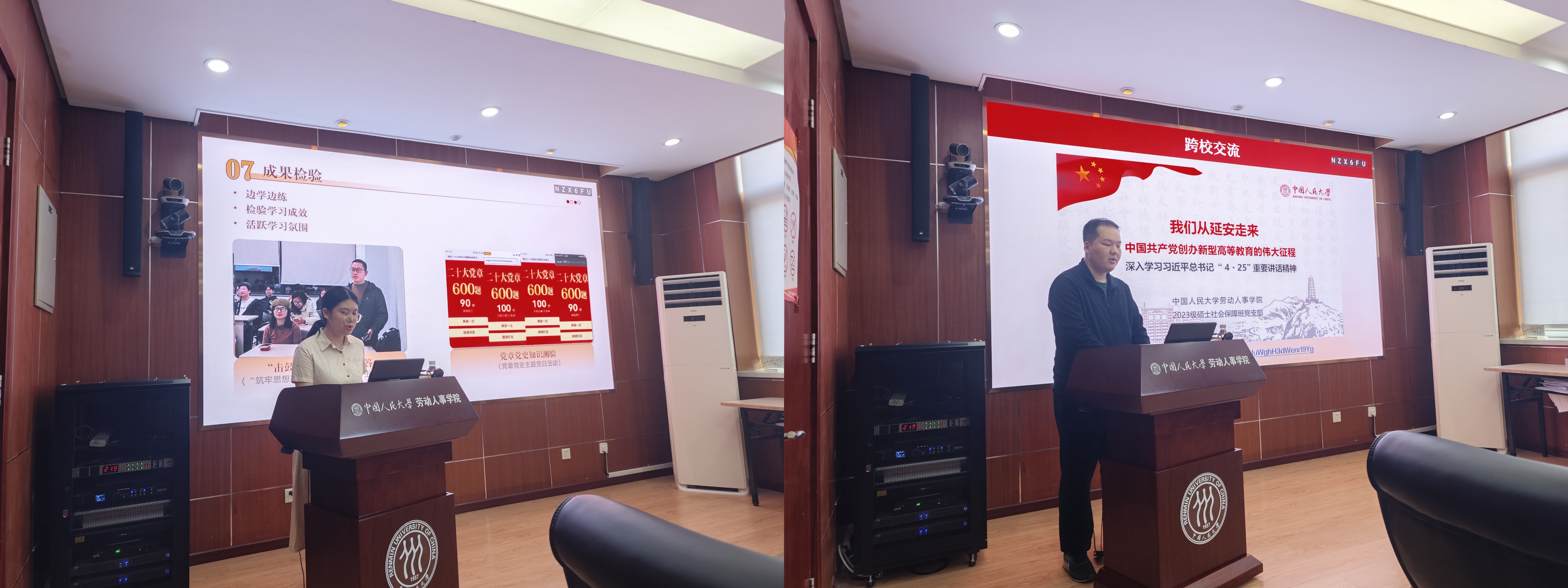 首先,本科第四党支部副书记陈晓彤分享了本科党支部主题党日活动的内容与形式,她强调本科支部主题党日活动应充分利用人数优势。并在严肃的理论学习中,增加情景作答等具有趣味性的互动环节,从而吸引支部成员的参与。2023级硕士社会保障班党支部书记龚睿翔介绍了支部的联学创新活动,重点分享了主题党日活动的策划筹备过程,从大纲撰写到预算制定,再到模拟流程,他表示团结支部的全体力量去做成一件事会事半功倍。