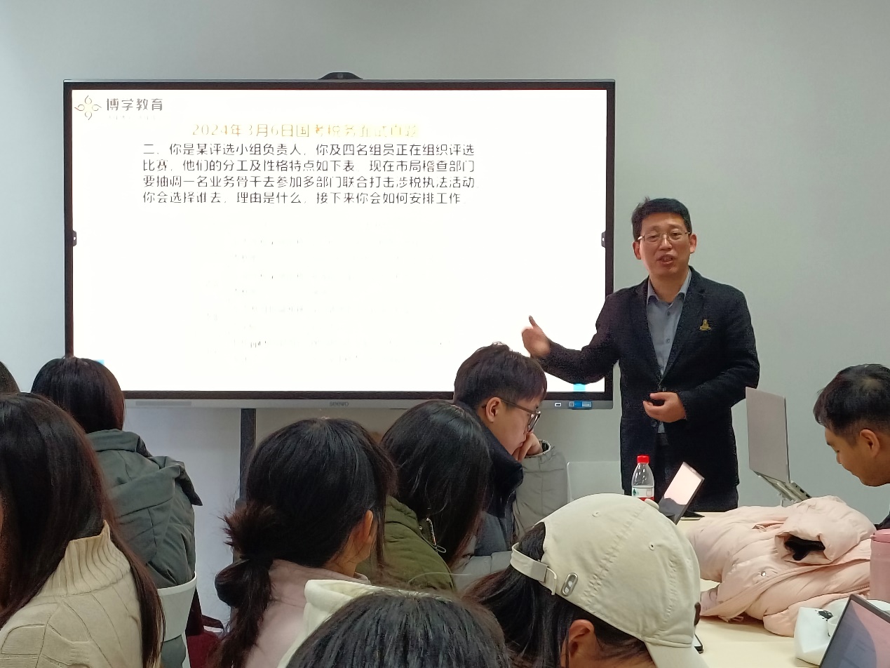 施久亮从知识、思维、能力、口才、心理、仪表形象方面全方位介绍了国考面试的细节与技巧,强调多层次多角度思考题目,运用创新思维解答题目,主次分明进行作答,针对不同的面试类型开展了考试实景示范,并针对不同面试类型进行逐一分析,直抓面试痛点,强调对各单位特点进行作答,并讲解面试测评要点;开展真题解析,对往年国考面试真题进行示范作答,引导在座同学进行独立思考与尝试作答,在作答过程中为同学们展示国考面试中知识、逻辑、情感、口才以及价值观的重要性。