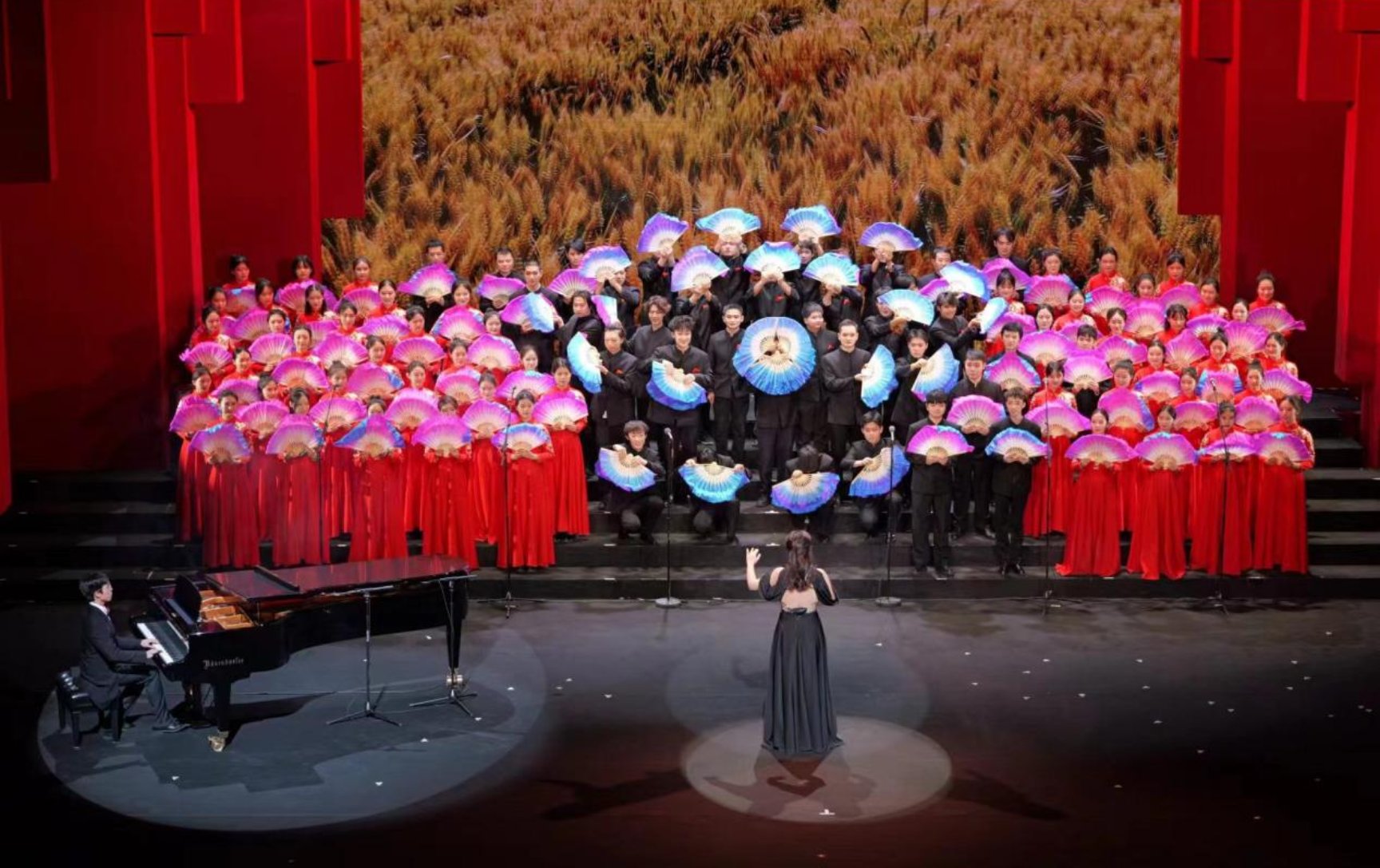 15:00,灯光骤暗,观众呐喊,由公司各级员工代表与公司五位老师组成代表队、由2023级硕士研究生刘奕池担任本次指挥,由2021级本科生邓天健负责钢琴伴奏,必威西汉姆官网平台代表队以最饱满的精神风貌登上舞台,以《南泥湾》唱响明德舞台,以手中扇挥舞陕北江南。乐章如诉,扇花开遍,红蓝翻飞;劳人学子用歌声讲述那段佳话,用手中彩扇绘就希望之画;垦荒南泥湾的光辉岁月在天边、在眼前、在我们每个人的心中。