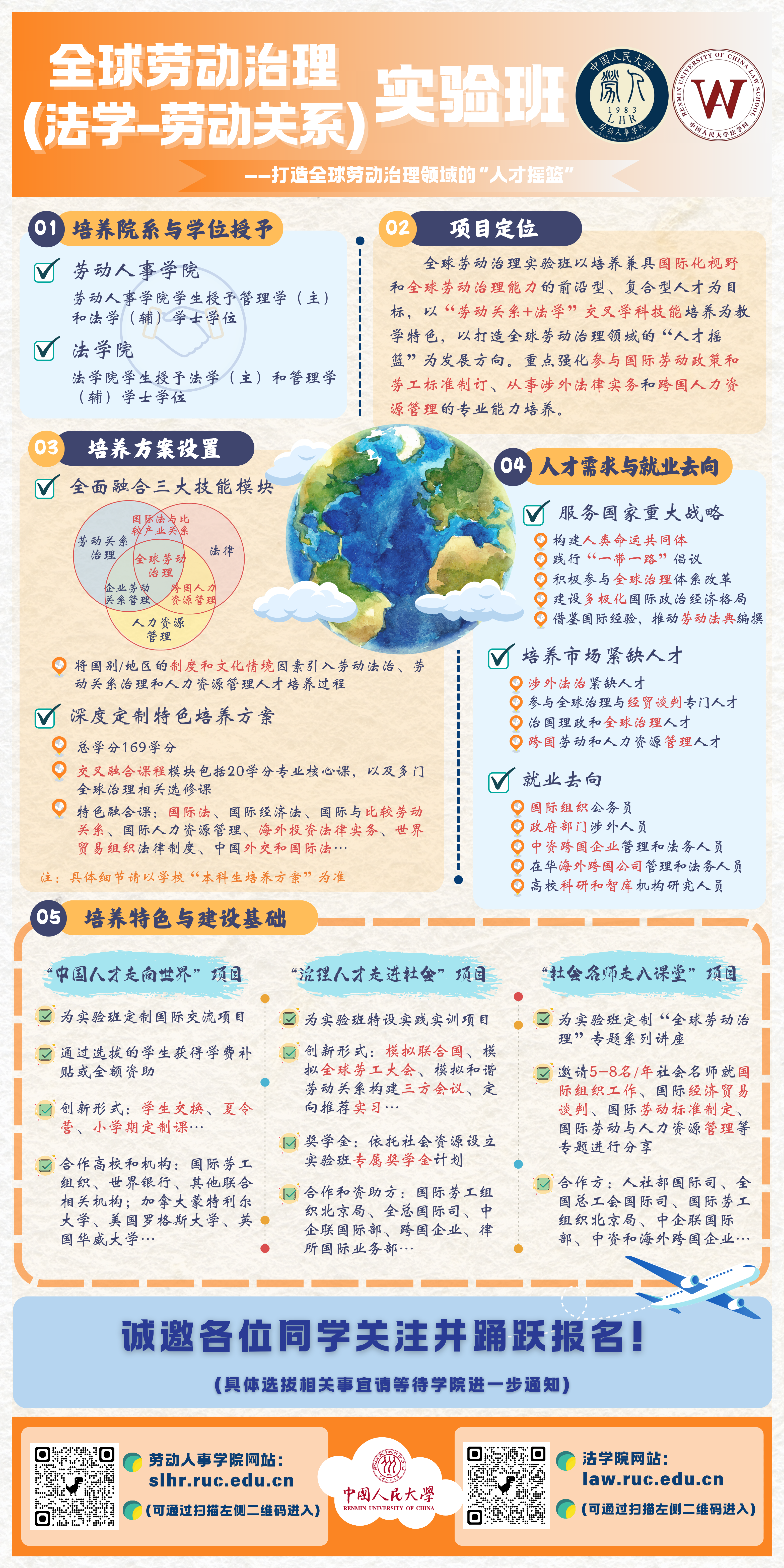 实验班项目紧扣国家重大发展战略需求,立足我国全球劳动治理领域人才培养的紧迫现实需要,将全球劳动关系治理、跨国人力资源管理和国际劳动与雇佣法治等技能模块融入传统劳动关系和法学交叉学科人才培养体系之中。重点培养具有扎实劳动关系和法学专业知识,具备参与国际劳动政策和劳工标准制订、从事涉外法务实践和跨国人力资源管理专业技能的高端、前沿、复合型全球劳动治理人才。从而为有关政府部门、国际组织和非政府组织提供参与全球劳动治理的专业人才,为“走出去”的中国企业与在华海外跨国公司提供专业化的雇佣实践指导,同时为相关领域高校和智库机构发掘并培养潜在的研究型人才。