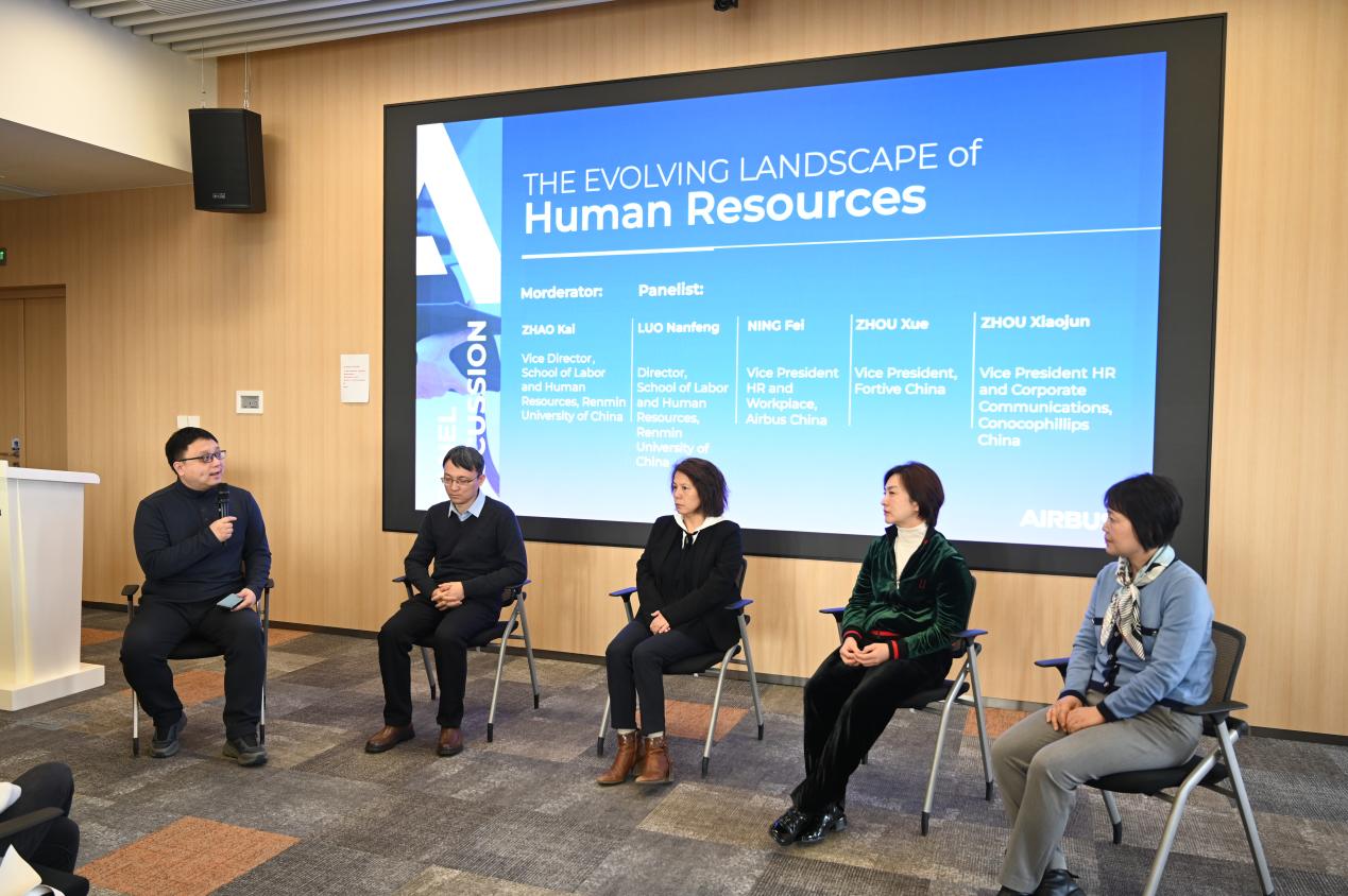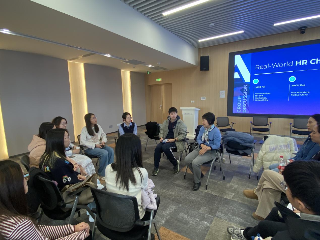 参访伊始,空中客车中国人力资源及工作场所副总裁、公司专业学位硕士研究生校外实践导师宁斐以“空客核心基因与人力资源实践”为主题,为师生们系统解读了企业的发展脉络与管理理念,并重点解读了公司在人力资源管理方面的创新实践。宁斐副总裁详细介绍了空客以“互敬互责”为核心的“I系列”文化理念,强调企业始终将“人”视为所有生产力的中心,致力于推动国际化视野与本土文化的深度融合。面对人工智能的发展趋势,她分享道,空客秉持“AI辅助人类而非替代人类”的原则,在招聘等人力资源环节中合理运用技术工具,同时始终坚守人文关怀的本质。在跨文化管理方面,依托企业源于法、德、英、西四国的多元基因,空客将文化包容性深度融入制度设计与日常运营,并通过国际化项目与人才流动机制,积极构建真正意义上的全球化团队。
