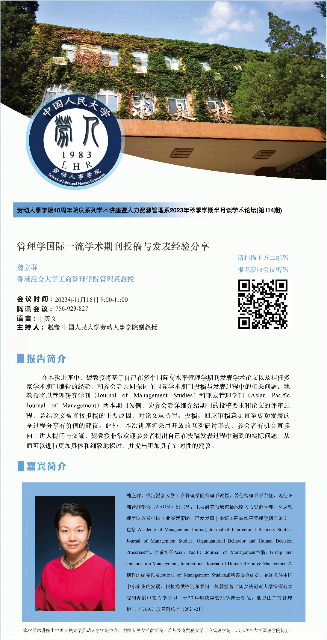讲座方式:线上讲座,腾讯会议ID:756-923-827(扫描下方二维码报名后即可获取会议密码)