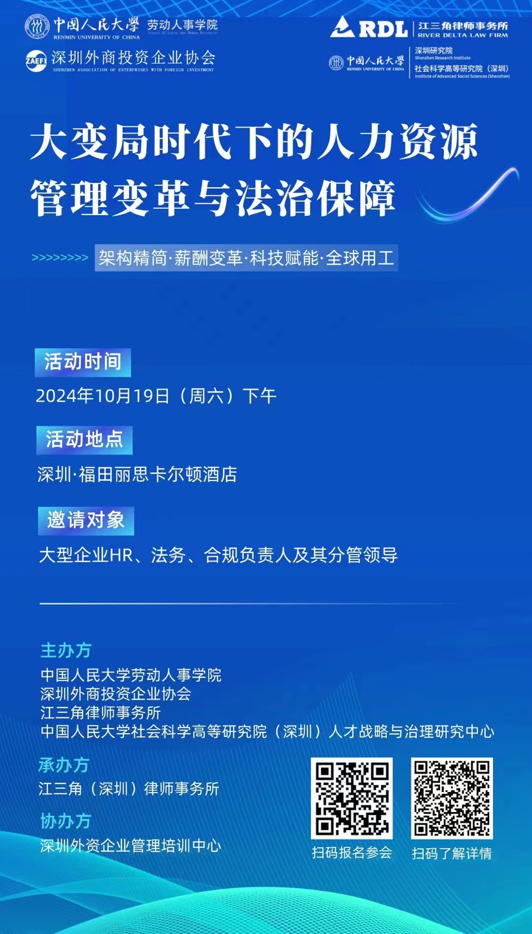 在此背景下,本次“大变局时代下的人力资源管理变革与法治保障实务论坛”由必威西汉姆官网平台、深圳外商投资企业协会、江三角律师事务所、必威西汉姆官网平台社会科学高等研究院(深圳)人才战略与治理研究中心主办,江三角(深圳)律师事务所承办,深圳外资企业管理培训中心协办。论坛将汇聚学界、律界和企业界的前沿智慧,在学术研究、法律适用、实务经验等方面展开经验分享和深入研讨,以期为大变局时代下的企业人力资源管理变革保驾护航。诚挚期待您的参与!