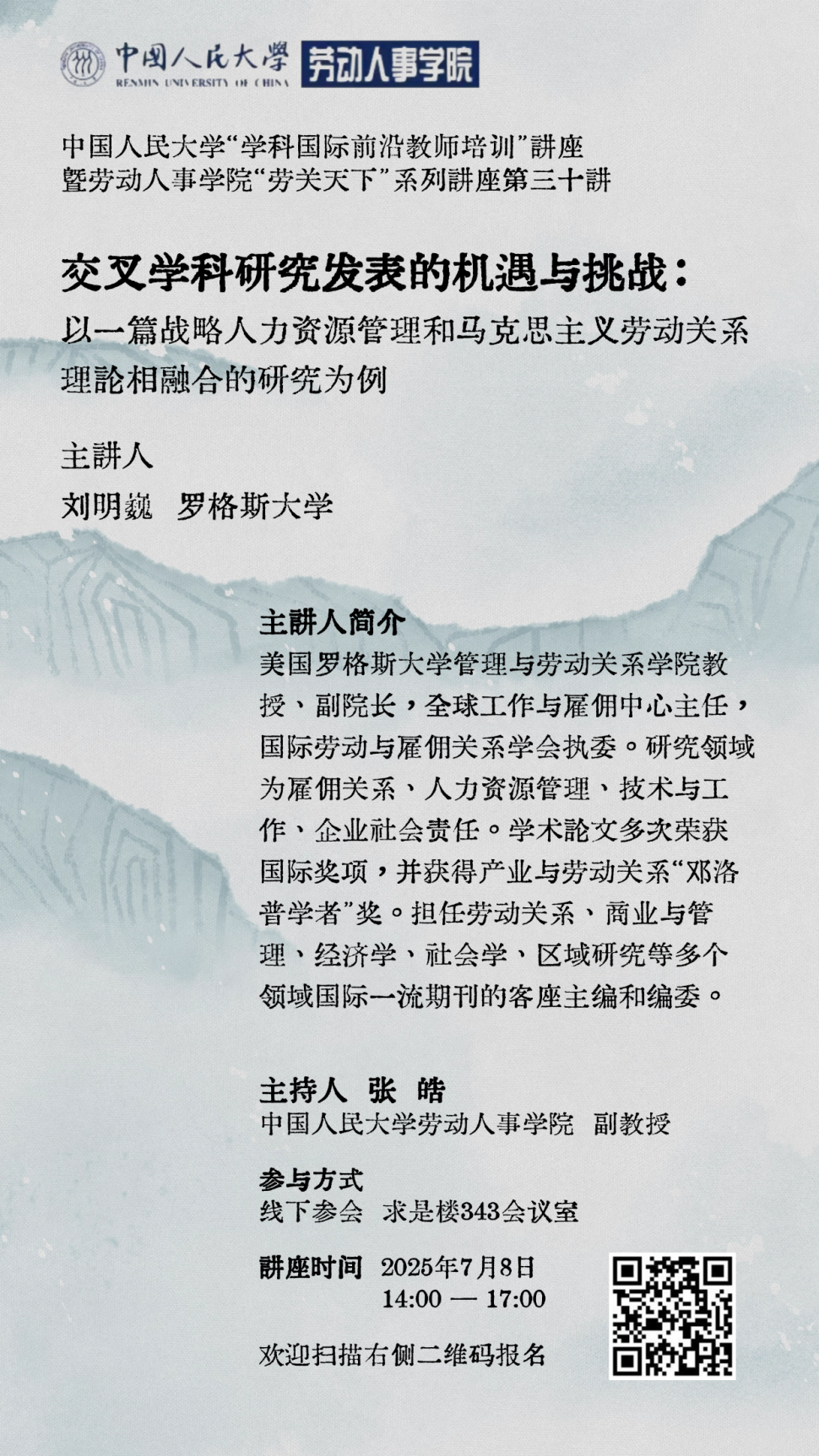 刘明巍,美国罗格斯大学管理与劳动关系公司教授、副经理,全球工作与雇佣中心主任,国际劳动与雇佣关系学会执委。研究领域为雇佣关系、人力资源管理、技术与工作、企业社会责任。学术论文多次荣获国际奖项,并获得产业与劳动关系“邓洛普学者”奖。担任劳动关系、商业与管理、经济学、社会学、区域研究等多个领域国际一流期刊的客座主编和编委。
