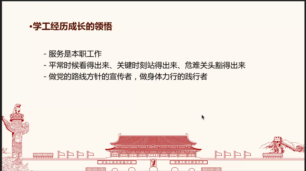 2018级劳动关系专业本科生陈佳雪分享了自己参加2019年国庆七十周年群众游行活动,担任2022年北京冬奥会志愿者的经历。她表示,自己在重大活动中深切体会到了当代青年与祖国同呼吸共命运的情感,立志努力成长为堪当民族复兴重任的时代新人。