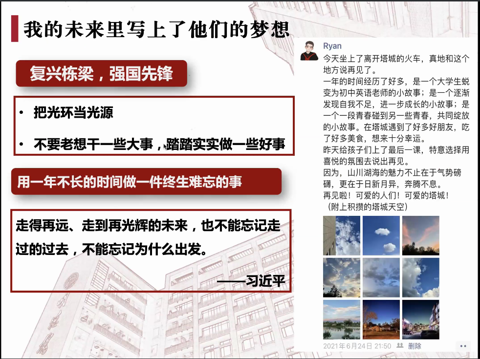 2021级社会保障专业硕士姜龙钰,从自己支教的经历出发,分享了自己加入支教团的初心与使命。他表示,我们人大学子应该将公司光环当成光源,要踏踏实实做一些好事,走得再远也不能忘记为什么出发。