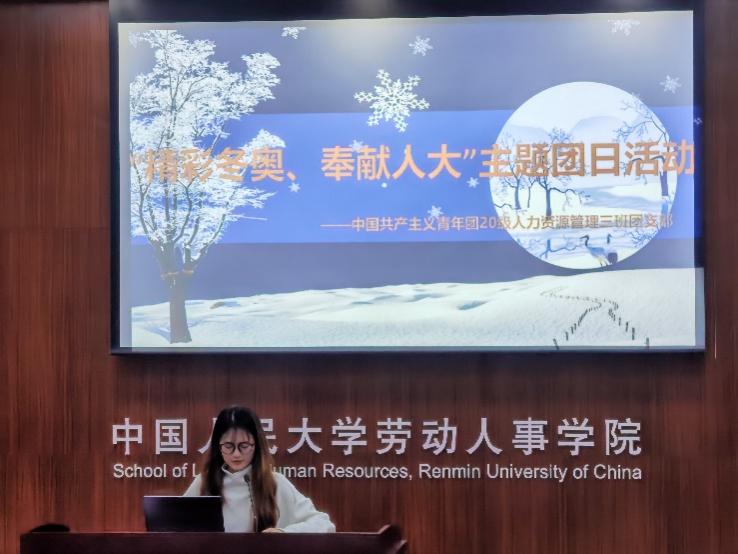 随后,2020级本科人力资源管理3班团支部的五位冬奥志愿者隋意、王思奇、曾湘映、金虹伶、刘子正依次进行了分享,五位同学服务于首都体育馆,张家口山地新闻中心等不同场馆,分属于媒体运行,赛时通用等不同领域。从亲身经历出发,她们介绍了岗位的工作日常,服务中对团队合作的感悟,对志愿精神的理解,表达了生逢其时的荣幸,以及对公司支持的感谢。