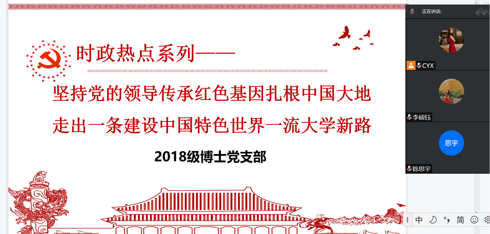 5月8日中午,必威西汉姆官网平台2018级博士班党支部开展线上主题党日学习活动,本次党日活动以“坚持党的领导 传承红色基因 扎根中国大地,走出一条建设中国特色世界一流大学新路”为主题。
