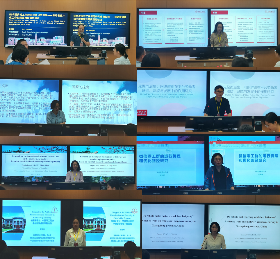 来自中山大学、华南理工大学、华东政法大学、南京财经大学、湘潭大学、哈尔滨商业大学和公司的8位专家学者进行了报告,内容包括技术进步对工作时间碎片化的影响、互联网使用对劳动者就业质量的作用机制、微信零工群的运行机理和优化路径、自动化技术对制造业工人就业及技能的影响等重要议题。