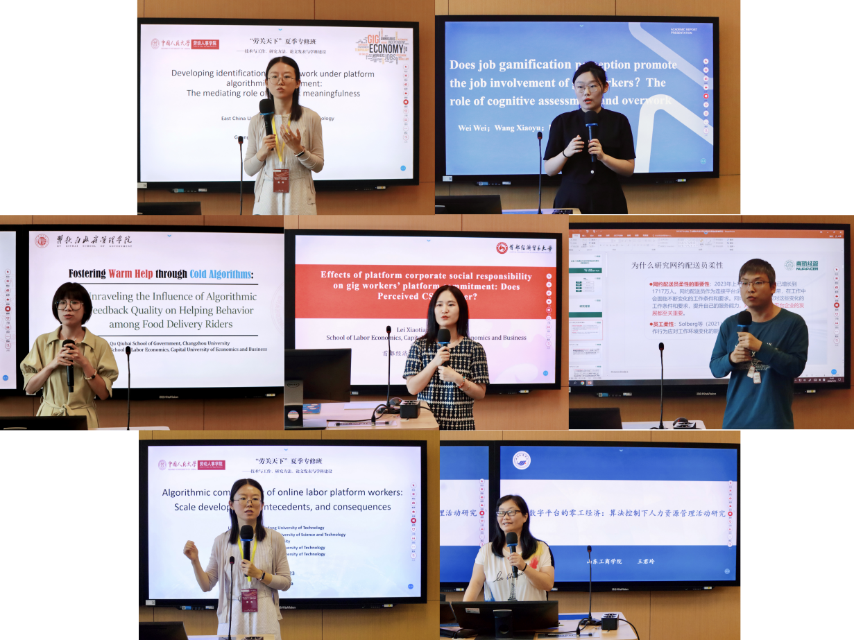 来自南京航空航天大学、华南理工大学、首都经济贸易大学、北京物资公司、常州大学、山东工商公司的6名专家学者进行了7组报告,与会师生围绕平台算法管理下的零工身份认同构建机制、算法控制下零工工作者工作卷入的作用机制、平台劳动者的组织依附性、平台应用算法推荐技术带来的伦理风险等具有现实性和实践意义的议题展开分享与讨论。