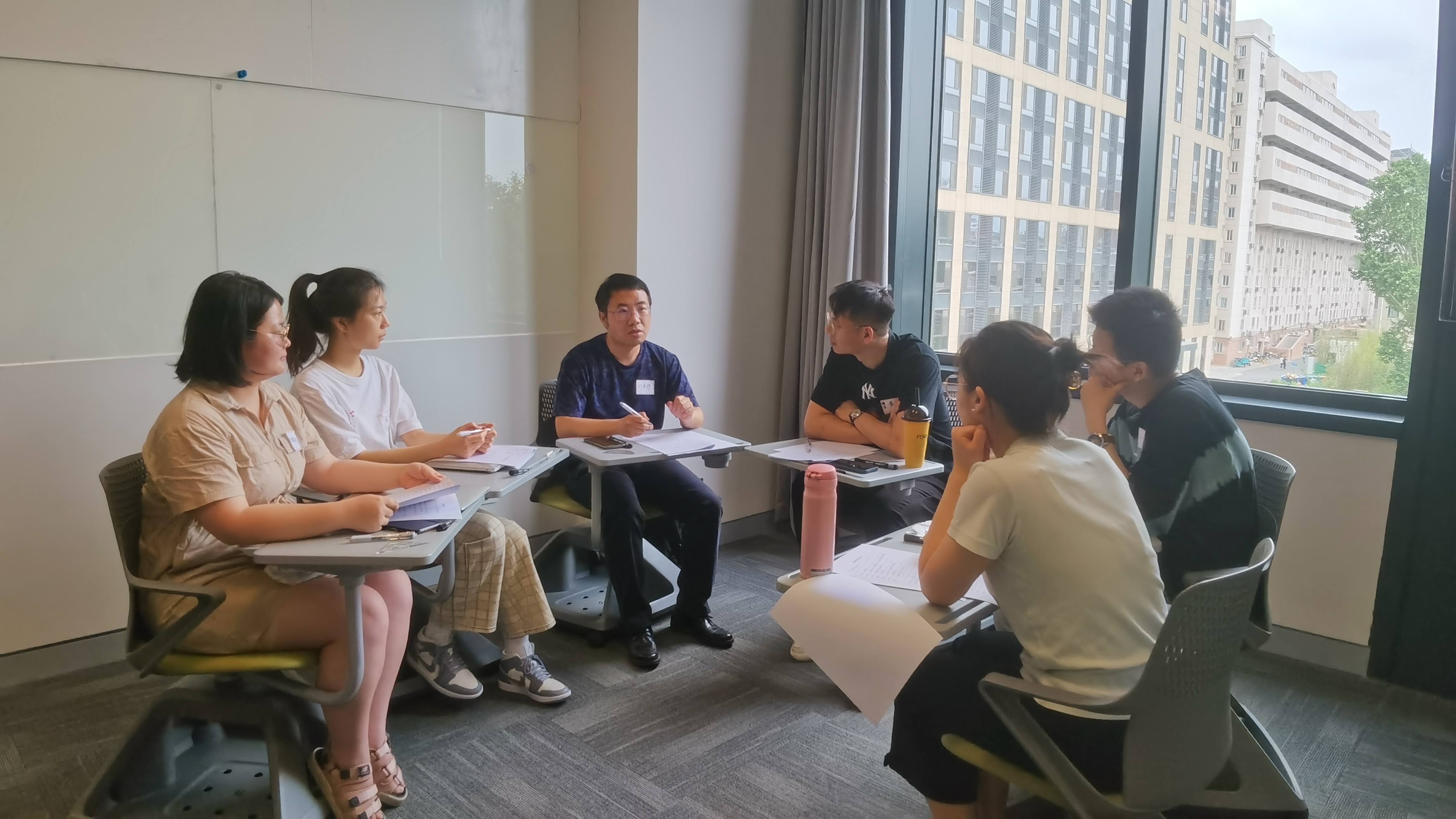 王鸿飞带领团体成员依次进行了热身、纸笔练习和交流分享等环节,探索自己的能力、优点,探讨可能从事的职业范围,直观地对比自身与想从事职业的匹配度。在纸笔练习中,成员们觉察自己的选择,充分领会自己的内心真实想法。在小组分享中,每个人都积极讨论、相互反馈,表达自己最真实的想法与感受,“特邀嘉宾”的职业经历和人生阅历也更大程度地激活了团体本身的资源。
