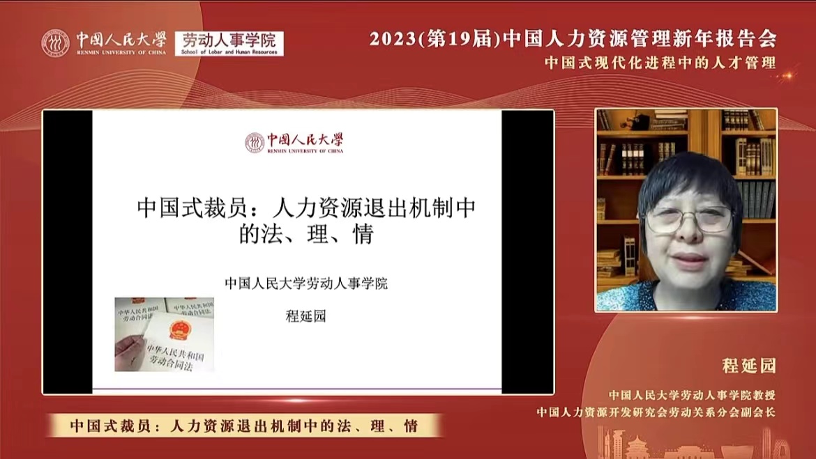 必威西汉姆官网平台教授程延园发表了《中国式裁员:人力资源退出机制中的法、理、情》主题演讲。程延园教授强调,企业裁员必须经得起法理和情理的考量,要做到符合国家法律规定,还要更多站在被裁者角度考量。并从裁员方案和裁员沟通两方面总结了中国式裁员“法、理、情”融合的独特做法。一方面,中国企业的裁员方案要遵循“法、理、情”的逻辑,以法律依据为首;另一方面,裁员沟通需遵循“情、理、法”的逻辑,先讲人情,后讲道理。最后,程教授通过案例介绍强调,裁员过程中必须沟通精准到位,做到“法、理、情”的融合。