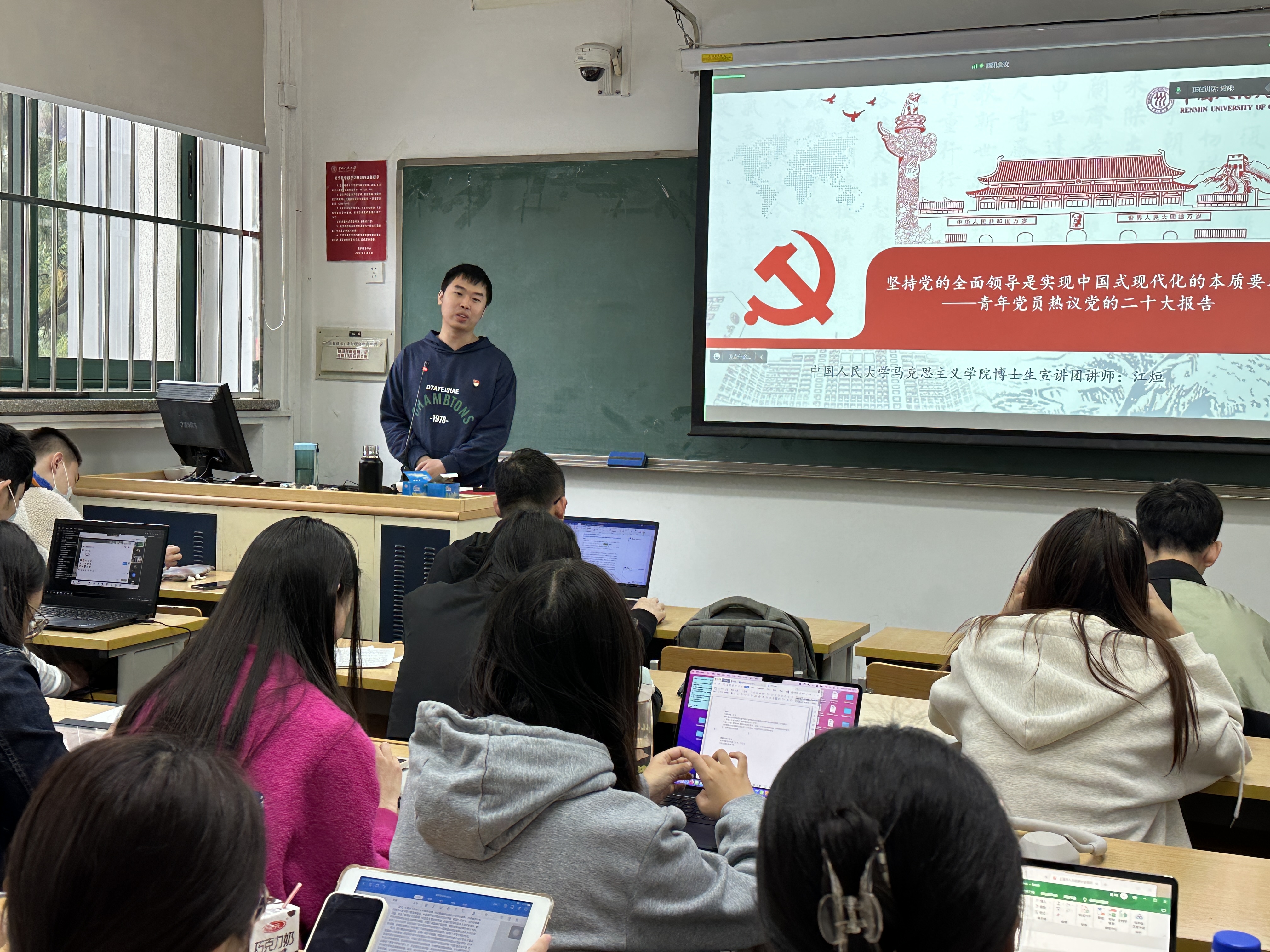 活动伊始,江烜围绕“坚持党的全面领导是实现中国式现代化的本质要求——青年学子热议党的二十大报告”这一主题,从党的历史出发,深入浅出地诠释了历史和人民为什么选择中国共产党以及为什么要坚持党的全面领导。作为青年学子,应该要从两个角度去看待党的二十大,一要从全面的角度出发,领悟党的二十大报告的宏观论断;二要从所学专业的角度出发,结合研究方向认识党的二十大报告。把握时代脉搏,抓住党和国家事业的发展规律,为全面建设社会主义现代化国家贡献青年学子之力。