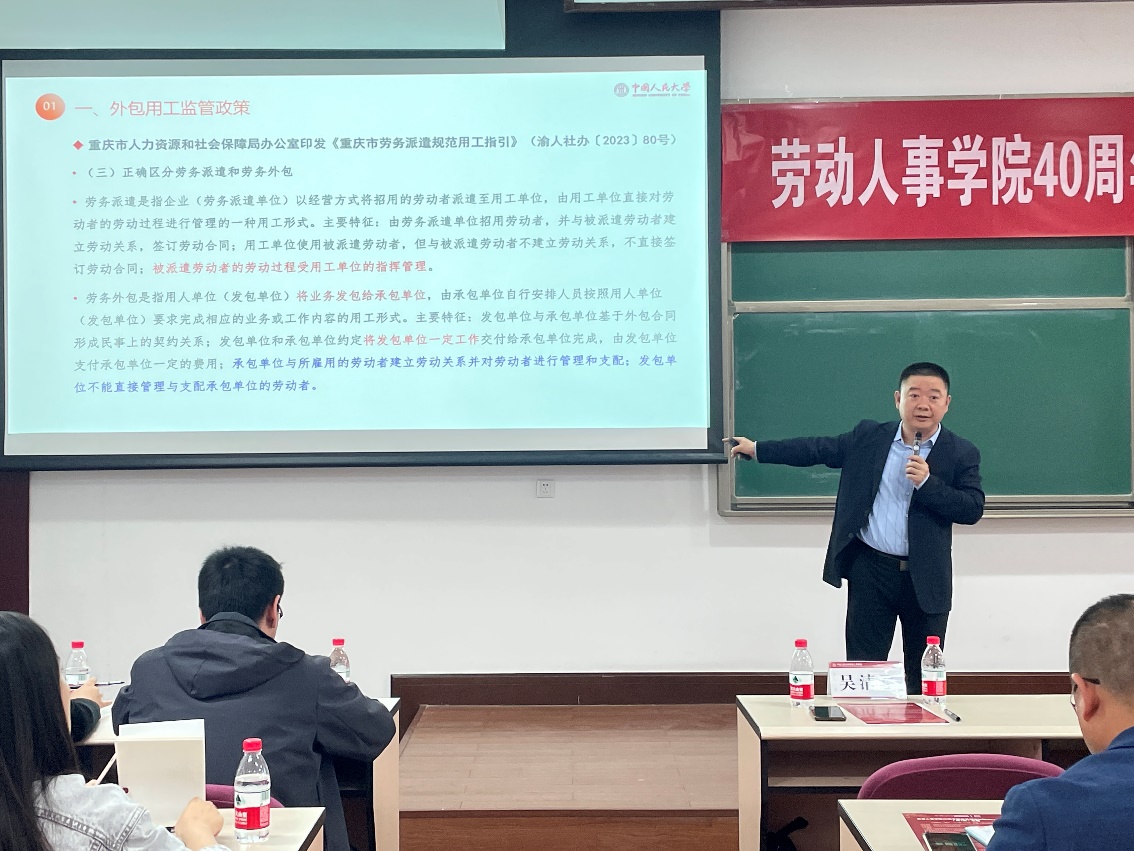 随后,吴清军教授以“灵活用工与外包用工的监管政策与合规管理”为题发表演讲。吴清军教授结合多家企业的真实案例,从外包用工监管政策、平台用工与外包用工、外包用工合规管理等方面,向与会者详细介绍了中国企业平台用工模式,并指出平台用工对用工理念的影响,为探讨外包用工和平台灵活用工在中国劳动力市场上的影响带来深刻启发。