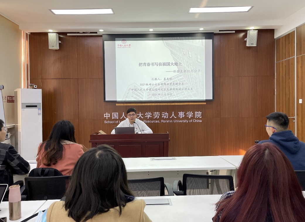 主题研学结束后,支部党员姜龙钰同志结合在新疆支教的经历和感悟,给大家带来“把青春书写在祖国大地上”的主题分享。