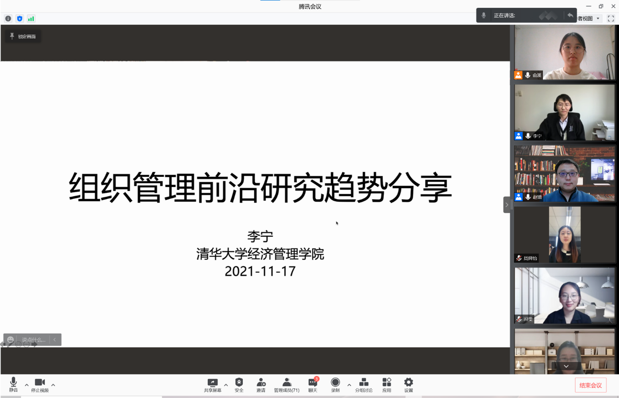 必威西汉姆官网平台人力资源管理系2021年秋季学期半月谈学术论坛(第94期)于2021年11月17日(星期三)下午14:00至16:00借助腾讯会议的途径于线上顺利开展。来自清华大学经济管理公司领导力与组织管理系的李宁教授分享了关于组织管理研究领域最新发展趋势的看法,并探讨了如何在该领域进行高质量和有影响力研究的相关话题。本次学术论坛由必威西汉姆官网平台赵锴副教授主持,孙健敏教授、周文霞教授、徐世勇教授、刘松博教授、李育辉教授、王桢教授、王青副教授、王丽娟副教授、骆南峰副教授、于坤副教授、陈雯助理教授、李海蓉助理教授、冯雯助理教授、陈力凡助理教授,以及近七十位博士生和硕士生参与了此次线上讲座和讨论。