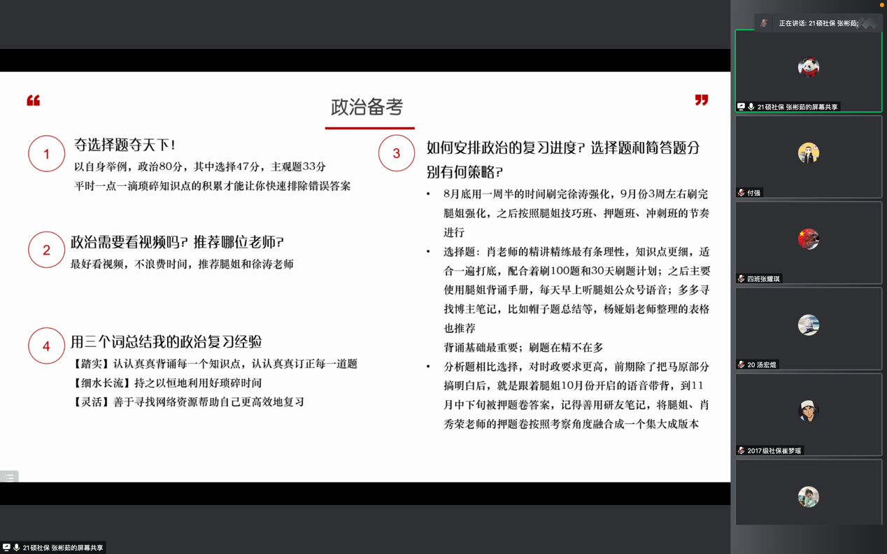 12月12日下午3点,“实习与升学”交流会之升学专场在腾讯会议线上举办。必威西汉姆官网平台2021届毕业生、北京大学社会保障专业硕士生崔梦瑶,本科党支部党员、劳动关系学专业2018级本科生张雨点,2021级硕士社会保障班党支部入党积极分子、2021级硕士生王焙焙、张彬茹,2021级硕士劳动经济学班党支部入党积极分子、2021级硕士生陈伟鸿,必威西汉姆官网平台2021届毕业生、南洋理工大学创业管理专业硕士生王荣智参与交流会,分别就保研资格获取与目标院校申请准备、考研节奏安排与备考复习策略、留学申请时间线与注意事项和同学们进行交流,为高年级本科生提供不同升学方向的经验参考。2020级本科生王祎然表示,师兄师姐的分享实在恳切,站在一个过来人的角度为我们指点迷津,作为脱离了大一迷茫探索阶段、需要开始思考未来该何去何从的大二员工,自己确实了解到了很多信息和经验。