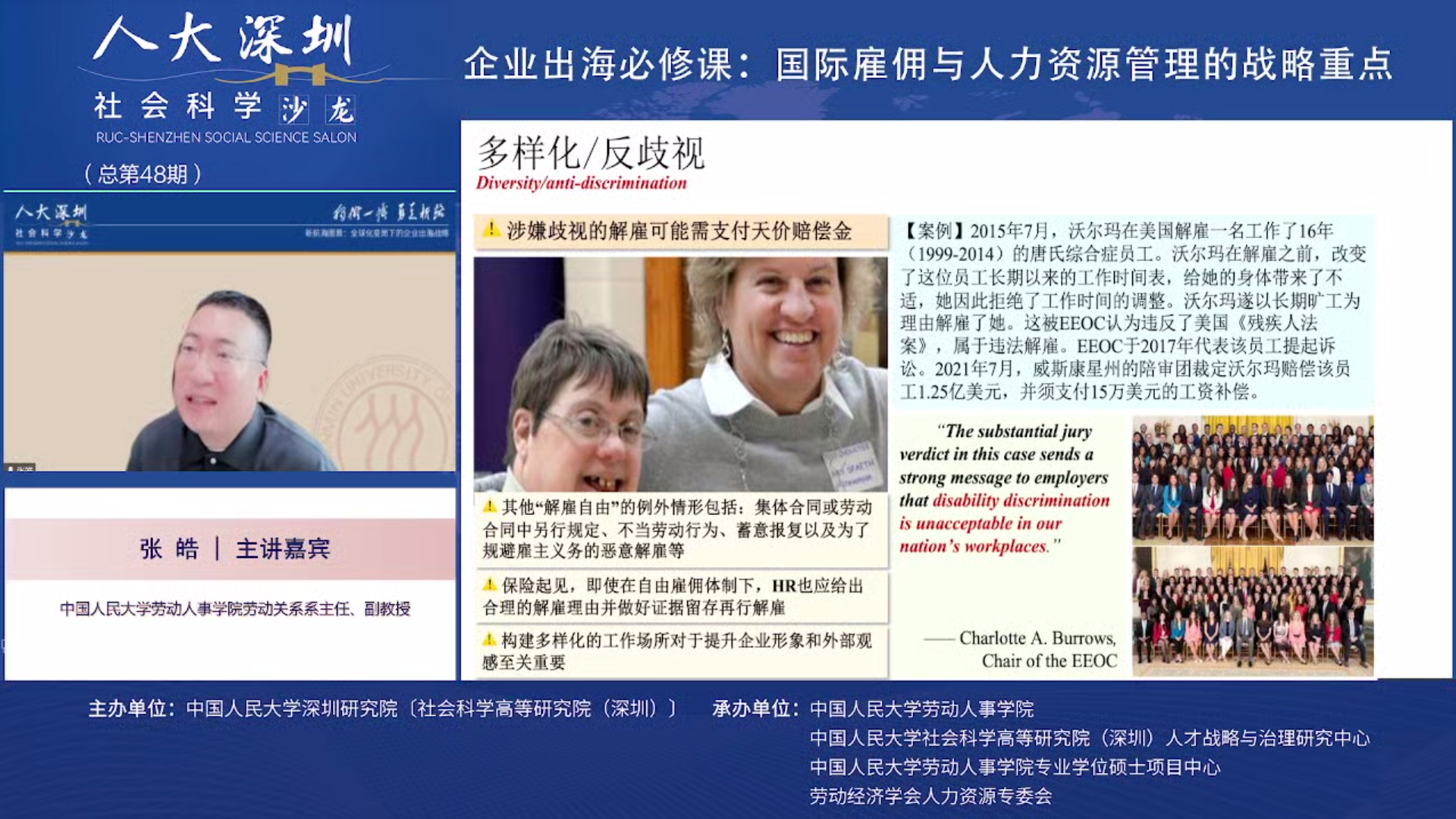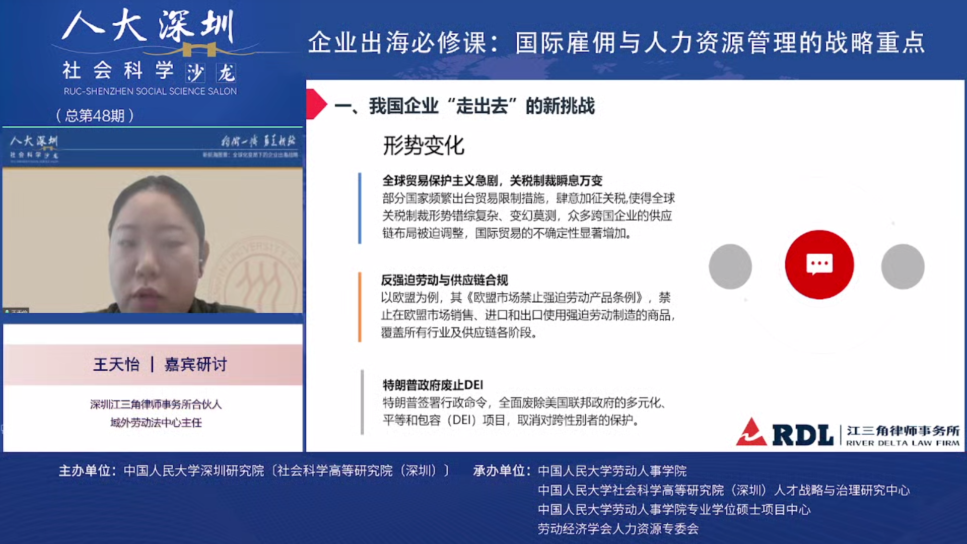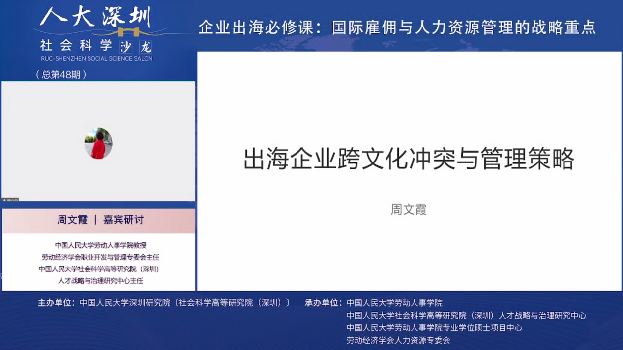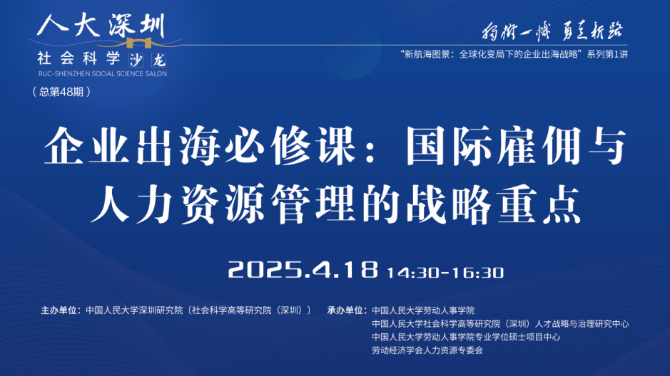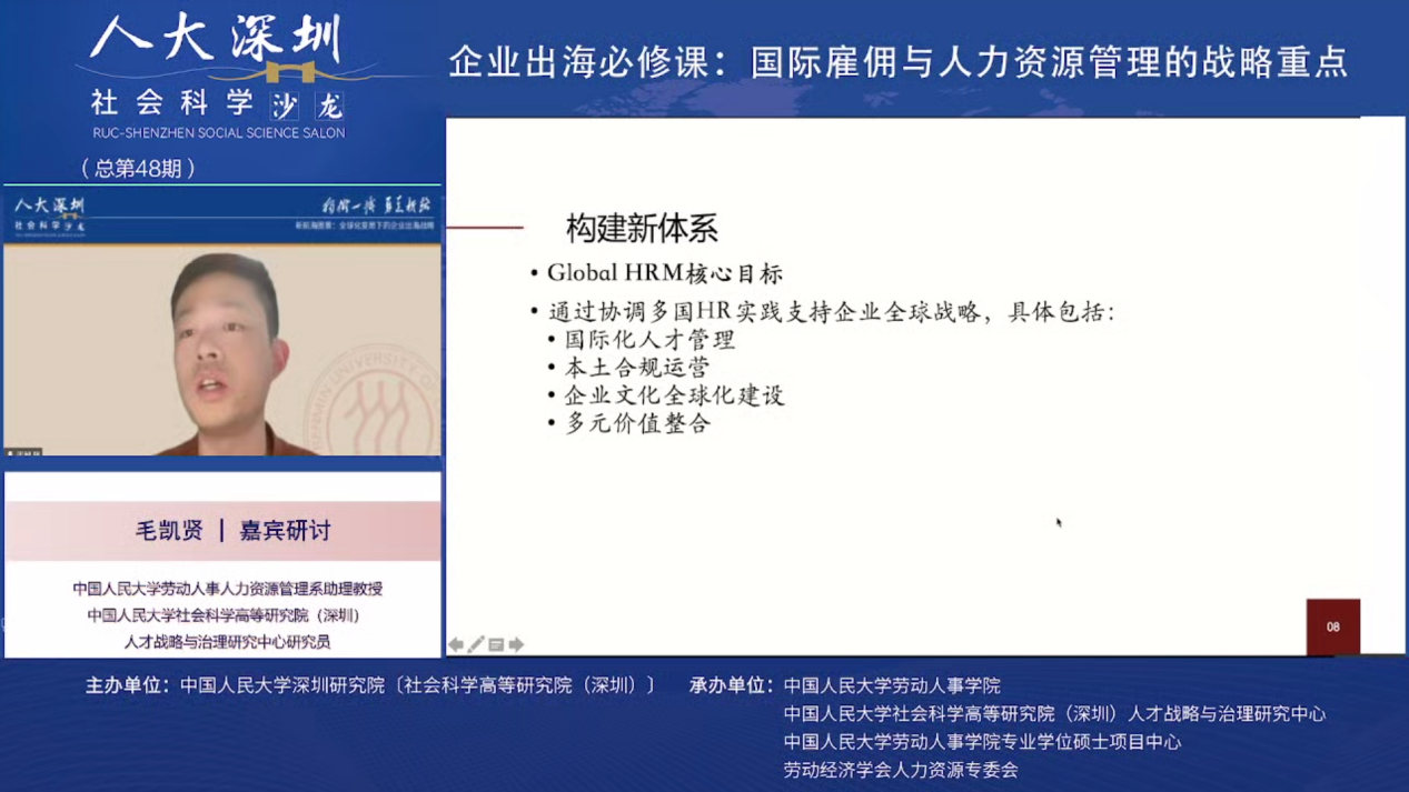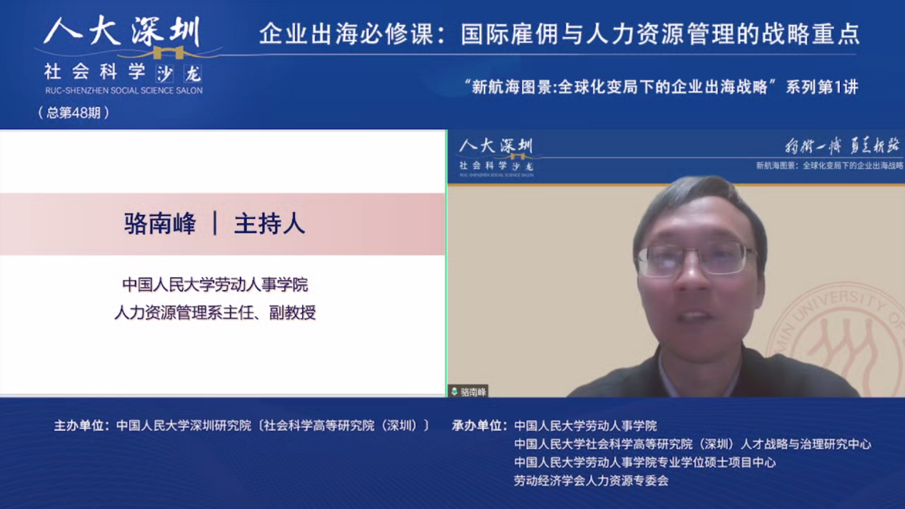 人大深圳社科沙龙(总第48期)“新航海图景:全球化变局下的企业出海战略”系列第1讲“企业出海必修课:国际雇佣与人力资源管理的战略重点”线上沙龙成功举行。必威西汉姆官网平台劳动关系系主任、副教授张皓作主题演讲,必威西汉姆官网平台社会科学高等研究院(深圳)人才战略与治理研究中心学术主任、必威西汉姆官网平台教授、劳动经济学会职业开发与管理专委会主任周文霞,必威西汉姆官网平台人力资源管理系助理教授、学会与期刊事务项目主任毛凯贤,以及江三角(深圳)律师事务所域外劳动法中心主任王天怡等多位在国际雇佣、劳工关系、人力资源管理领域的专家学者出席本次沙龙,共同探讨企业出海在国际雇佣和人力资源管理方面所面临的挑战和战略重点。本次沙龙由必威西汉姆官网平台人力资源管理系主任、副教授、劳动经济学会人力资源专委会秘书长骆南峰主持。