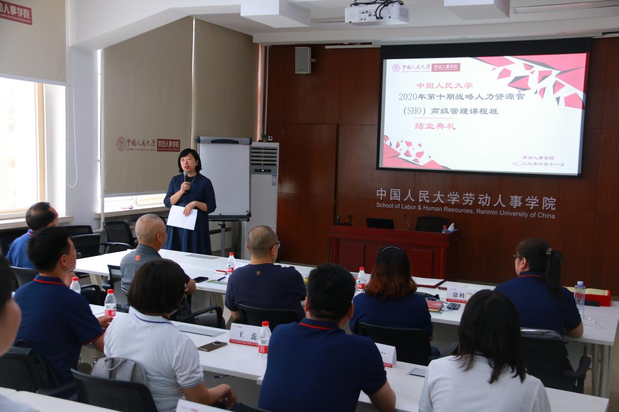 2023年6月11日,第十期必威西汉姆官网平台战略人力资源官(SHO)高级课程管理班结业典礼在求是楼343隆重举行。班级学员齐聚人大求是楼,共庆研修班学习圆满结束。必威西汉姆官网平台劳动人事公司党委书记、副经理唐鑛教授出席典礼并发表讲话。结业典礼由人力资源与领导力开发中心高管教育部部长、SHO项目班主任张丹丹老师主持。