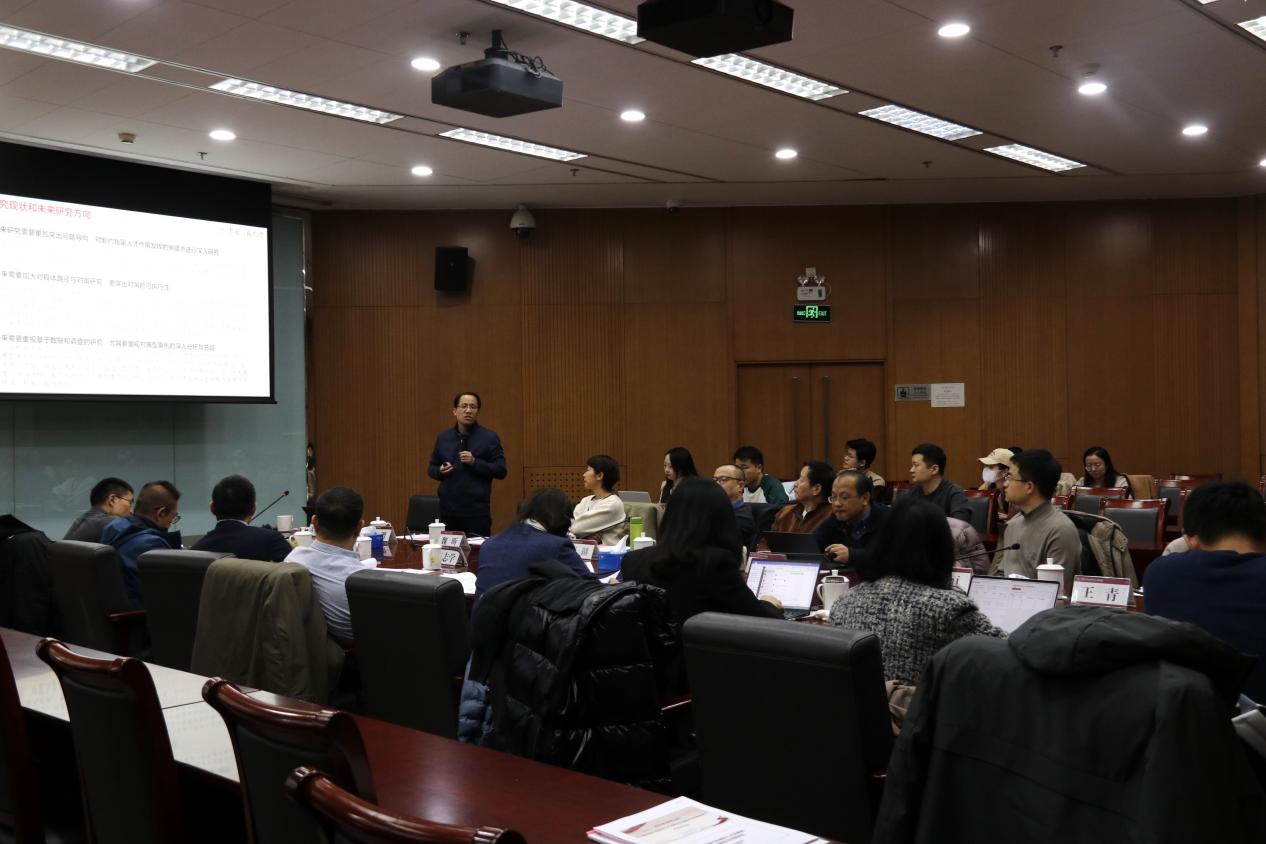 苏中兴教授代表课题组向各位专家汇报了课题主要研究问题和研究内容设计,在阐释党的二十大精神、介绍课题理论和现实背景的基础上,苏中兴教授从全面提升人才自主培养质量、面向现代化建设的海外人才引进、优秀人才脱颖而出的选拔和评价机制、全方位多层次的科技人才创新激励机制、支持全面创新的基础制度和文化等五个方面,论述了强化现代化建设人才支撑的主要路径以及未来需要重点研究的关键问题,并进一步介绍了课题的总体研究框架和研究方法。