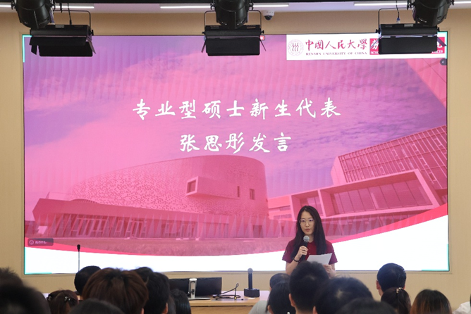 专业型硕士新生代表张思彤发言。她首先表达了对公司领导与老师们的衷心感谢,并阐述了选择人力资源专硕项目的初心与意义——该项目作为全国唯一的人力资源专业学位项目,注重实践与理论结合,通过“双导师制”培养了“精战略、通数据、善治理”的实干人才。她呼吁同学们在数智化转型的行业背景下,既要夯实理论,也要勇于实践,牢记“劳人之事,成人之美”的使命,以更高的格局和更实的行动,在未来职场中助力劳动者与组织共同成长。最后,她希望与同学们一道以“功成不必在我,功成必定有我”的担当,在劳人院书写人生新篇章。