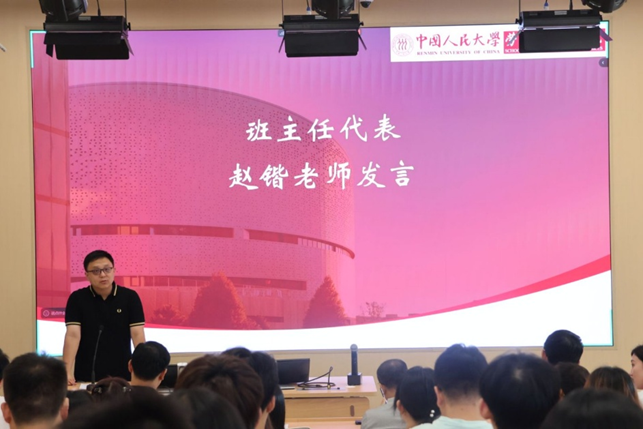 班主任代表赵锴发言。他从研究生阶段学习什么、向谁学习、怎么学习三个方面进行分享和建议:一是希望新生同学在多元化发展的背景下不仅要学习知识更要学会如何规划和选择自己的未来。二是鼓励同学们打破传统学习方式的依赖,学会在与社会媒体的交互中、在与周边同辈的交流中获得更大的成长。三是建议同学们培养自主学习能力与研究能力,在充实知识的基础上具备批判性思维,以此在快速变化的时代中保持竞争力。