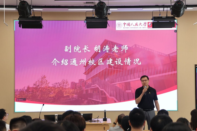 副经理胡涛从三个方面对通州校区的建设情况进行了全方位的介绍,着重强调通州校区的落地具有建设北京城市副中心和疏解非首都职能的重大战略意义。他从东南西北四个方位详细介绍了通州校区的区位优势,带领新生同学了解了新校园周边的商业区、政府机构与文化地标。最后,胡涛指出新校区在住宿、运动、就餐、上课等方面的配套设施完善,为大家提供了良好的学习和研究环境。