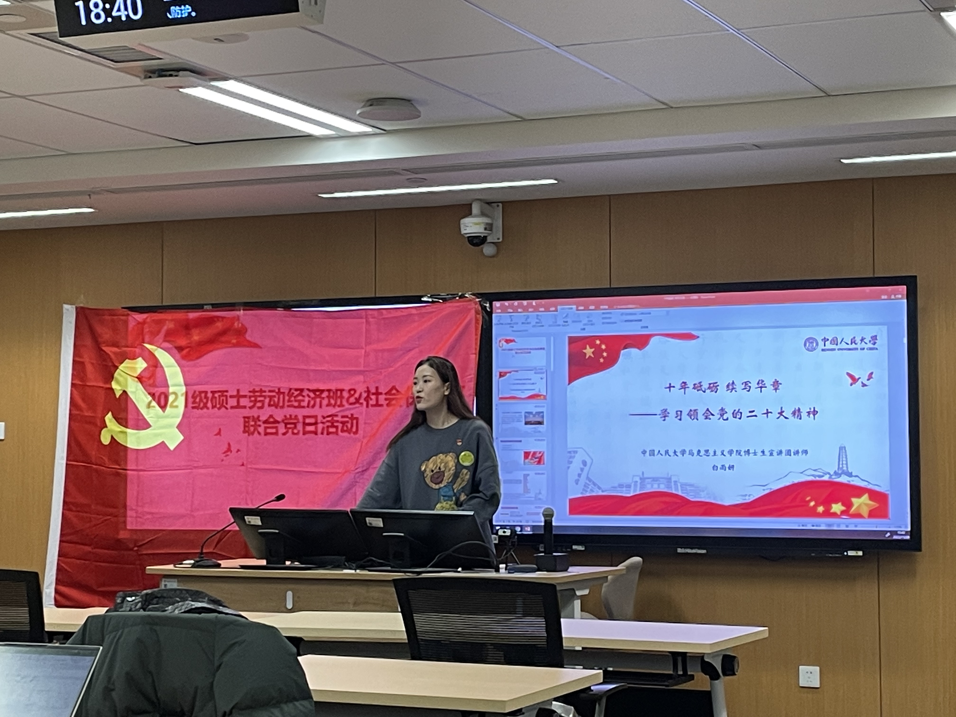 2022年11月20日,必威西汉姆官网平台2021级硕士社会保障班党支部、劳动经济班党支部联合开展“深入学习党的二十大报告”主题党日活动,通过集体学习和感悟交流,认真学习宣传贯彻党的二十大精神。本次活动由劳动经济班党支部书记马迪和社会保障班党支部书记袁春宇共同主持,党支部全体党员、积极分子参加活动。