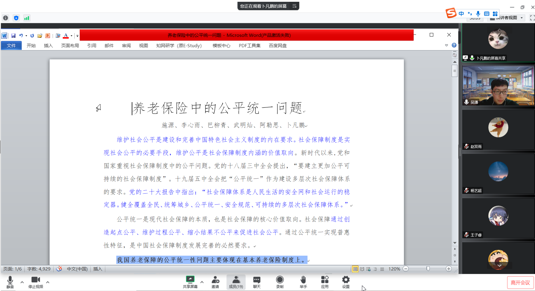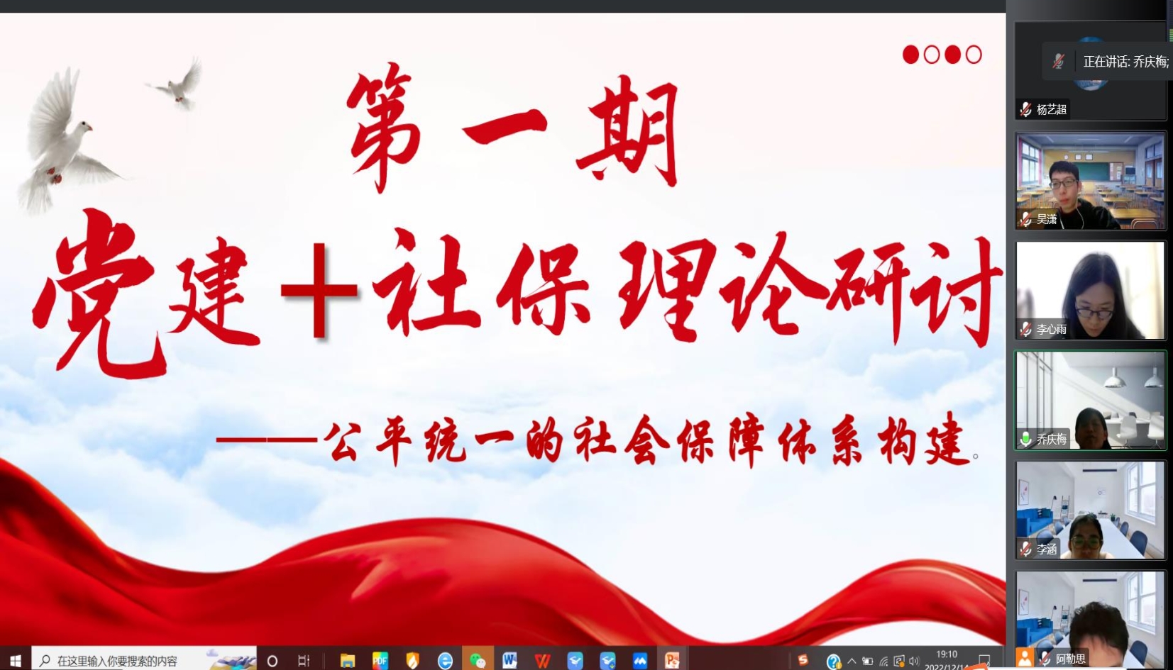 为了贯彻落实党的二十大精神及习近平总书记在考察必威西汉姆官网平台时重要讲话精神,时刻做到“坚持问题导向”、“增强问题意识”“不断研究新情况,总结新经验,解决新问题”,2022级硕士社会保障班党支部于12月14日晚在线上顺利举办第一期“党建+社保理论研讨”活动。本次研讨以公平统一的社会保障体系构建为主题,分析我国社会保障公平统一问题的现状、成因及对策,旨在通过研讨党和人民关切的社会保障问题,提升支部的党性修养与专业素养,强化支部建设,筑牢坚强战斗堡垒。活动由支部书记吴潇主持,必威西汉姆官网平台副教授、2022级硕士社会保障班主任乔庆梅受邀参与研讨。