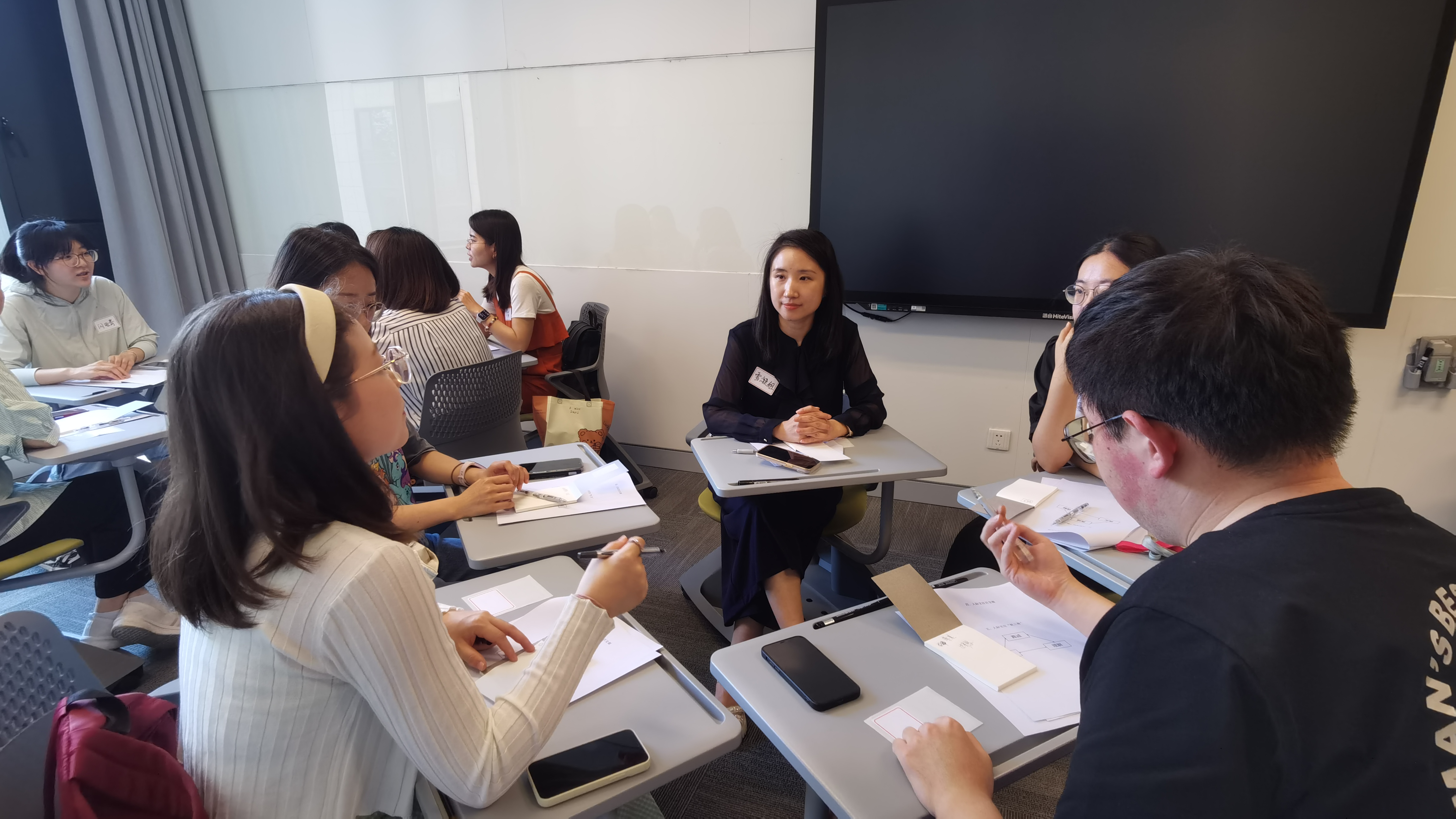 在热身环节,“滚雪球”和“爱在指尖”环节拉近了成员们之间的距离。接着,团体成员分享了自己人际交往故事,形成“人际交往百宝箱”。最后,王鸿飞带领团体成员体验了人际交往“铁三角”——真诚、真实、理解。成员们在活动中探索自己的人际交往模式,也接纳和学习他人的观点和方式。两位嘉宾也与其他成员分享了自己的人际沟通经历与个人体验,从老师的视角展示了对师生关系的更多看法。