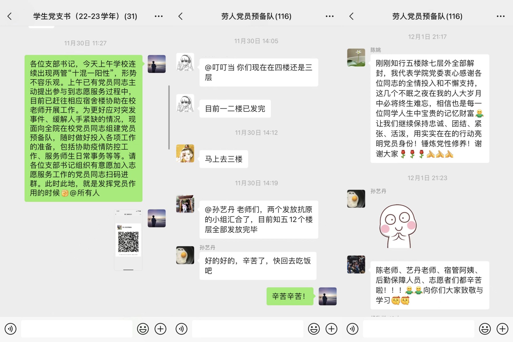 本科第三党支部党员、员工志愿者隋意表示,今天在现场身临其境见证的画面,这些发自内心为公司老师同学们骄傲的时刻,或许将来很久很久都不会忘记:发抗原的时候,陈姚老师拦住我们,自己一个人去了七层;艺丹老师一边拖着很重的午餐的小推车,一边在各种群里回复大家的消息;一位师兄很仔细地戴手套做消杀,说不担心自己的安危,但要做好防护,千万不能回去之后牵连室友;有楼层长在发抗原时一直陪在我们旁边,逐个记录来的是哪个寝室的同学,这样方便筛查还有哪些寝室没有来。今天是我们2020级本科同学们来到人大的第801天,这一天很普通,也很特别,它让我们懂得:我们能做的,大概是平日里踏实做好分内事,在特殊时期为组织贡献力量。还记得当时转预备党员谈话时做的承诺——当党旗没有在头顶高高飘扬、当党徽没有在胸前闪闪发光的时候,我们能否记得自己政治面貌所意味的责任,这或许是最好的试金石。很幸运,这般真切地见证这些人们就在身边。