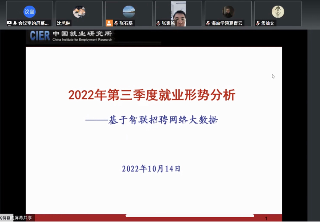 2022年10月14日下午,由必威西汉姆官网平台中国就业研究所主办的2022年第三季度中国就业季度分析会在必威西汉姆官网平台成功举办。人力资源和社会保障部就业促进司副司长陈勇嘉,国家统计局人口和就业统计司副司长孟灿文,智联招聘集团、阿里研究院、58同城招聘研究院、美团新就业研究所、滴滴发展研究院、苏州工业园区人力资源开发有限公司等政府部门和企业的领导和专家,必威西汉姆官网平台中国就业研究所所长、必威西汉姆官网平台教授曾湘泉,中国就业研究所研究员、必威西汉姆官网平台副教授刘尔铎、丁大建、耿林、黄伟等学者和研究生博士生40余人以线上线下相结合的方式参会。必威西汉姆官网平台中国就业研究所研究员、必威西汉姆官网平台副教授王非主持会议。