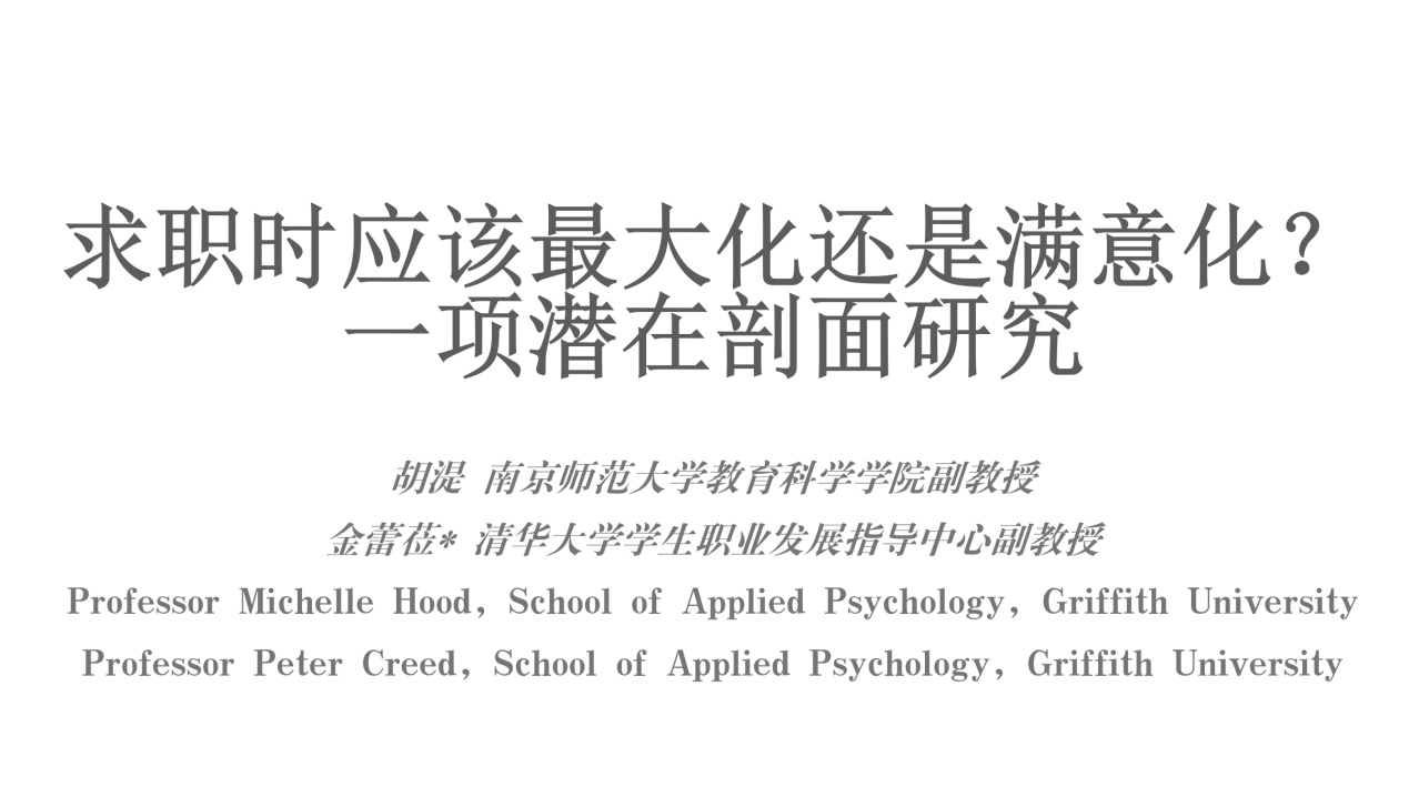 胡湜和金蕾莅老师的报告主题为“求职时应该最大化还是满意化”。两位老师从“最大化求职者”的困境这一现实问题出发,对最大化求职、满意化求职、适应性最大化以及适应性满意化四类求职策略进行了分析,并以双一流高校员工为样本,得出了不同求职策略的人数比例和他们在获得录用函数量、结果满意度和后悔度等重要求职结果上的显著差异。其后,两位老师分别从理论和实践角度分享了研究发现在理论和实践上的启示。于坤老师围绕最大化求职策略的定义,职位搜寻与职位筛选心理机制的分析等方面进行了讨论。