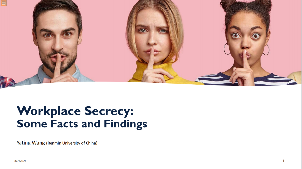 王亚婷老师的报告主题为“组织中的人际保密现象”。王老师介绍了自己对组织中的保密现象的由来和研究背景,并介绍了自己关于这个话题的一系列开创性研究,组织中保密现象的定义、频率、动机等。随后王老师着重介绍了自己一项关于员工感知的领导保密行为带来的一系列员工行为和情绪后果及其中介和调节机制的研究。金秋萍老师就研究的假设、研究方法的选择和未来研究方向拓展等方面进行了讨论。