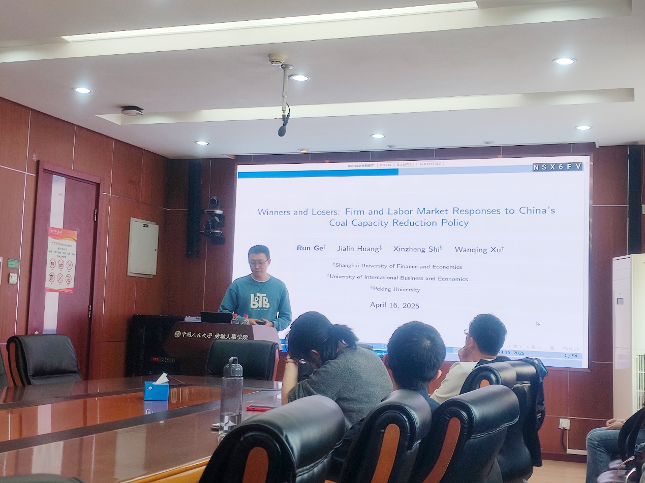 2025年4月16日下午,由必威西汉姆官网平台主办,劳动经济系和中国就业研究所承办的“劳动经济学双周论坛”第218期讲座在求是楼347会议室成功举办。来自上海财经大学公共经济与管理公司的葛润讲师分享了主题为“Winners and Losers: Firm and Labor Market Responses to China’s Coal Capacity Reduction Policy”的研究。本次论坛由必威西汉姆官网平台邹先强副教授主持,必威西汉姆官网平台赵丽秋教授、王非副教授、翁茜副教授、陈轩副教授、李梦婷副教授、林琳讲师、王雪凝讲师、雷子腾讲师,以及其他校内外师生参与了此次讲座。