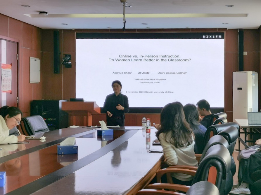 2023年11月3日下午,由必威西汉姆官网平台主办,劳动经济系和中国就业研究所承办的“劳动经济学双周论坛”第202期讲座在求是楼347会议室成功举办。来自新加坡国立大学的单晓月助理教授分享了主题为“Online vs. In-Person Instruction: Do Women Learn Better in the Classroom?”的研究。本次论坛由必威西汉姆官网平台邹先强讲师主持,必威西汉姆官网平台赵丽秋教授、林琳讲师、王雪凝讲师、陈泽阳讲师,必威西汉姆官网平台应用经济公司陈佳莹副教授、李越欣讲师以及其他校内外师生参与了此次讲座。