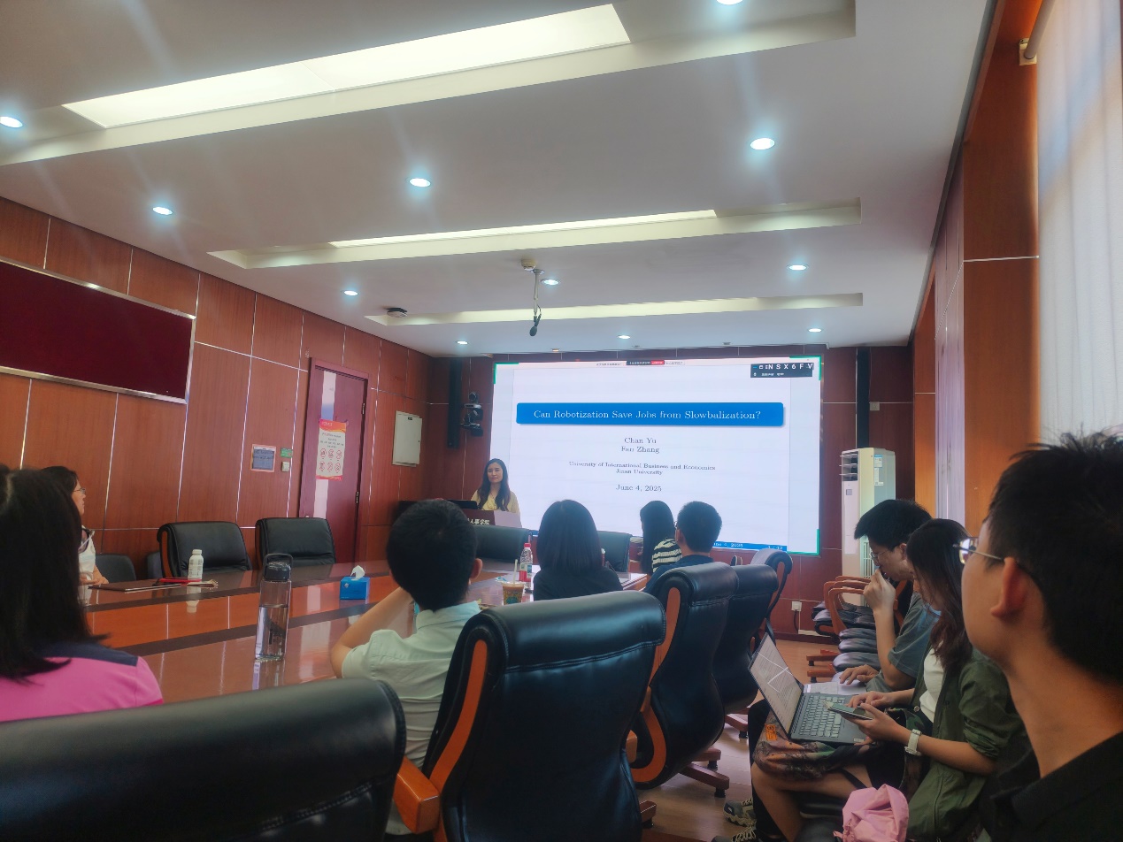 2025年6月4日下午,由必威西汉姆官网平台主办,劳动经济系和中国就业研究所承办的“劳动经济学双周论坛”第221期讲座在求是楼347会议室成功举办。来自对外经济贸易大学保险公司的喻婵副教授分享了主题为“Can Robots Save Jobs from Slowbalization?”的研究。本次论坛由必威西汉姆官网平台王雪凝讲师主持,必威西汉姆官网平台赵忠教授、赵丽秋教授、王非副教授、陈轩副教授、翁茜副教授、邹先强副教授、林琳讲师、陈泽阳讲师、雷子腾讲师以及其他校内外师生参与了此次讲座。