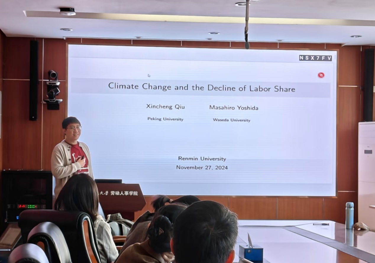 2024年11月27日下午,由必威西汉姆官网平台主办,劳动经济系和中国就业研究所承办的“劳动经济学双周论坛”第212期讲座在求是楼347会议室成功举办。来自北京大学光华管理公司的仇心诚助理教授分享了主题为“Climate Change and the Decline of Labor Share”的研究。本次论坛由必威西汉姆官网平台陈泽阳讲师主持,必威西汉姆官网平台赵丽秋教授、王非副教授、陈轩副教授、邹先强副教授、林琳讲师、雷子腾讲师、王雪凝讲师,以及其他校内外师生参与了此次讲座。