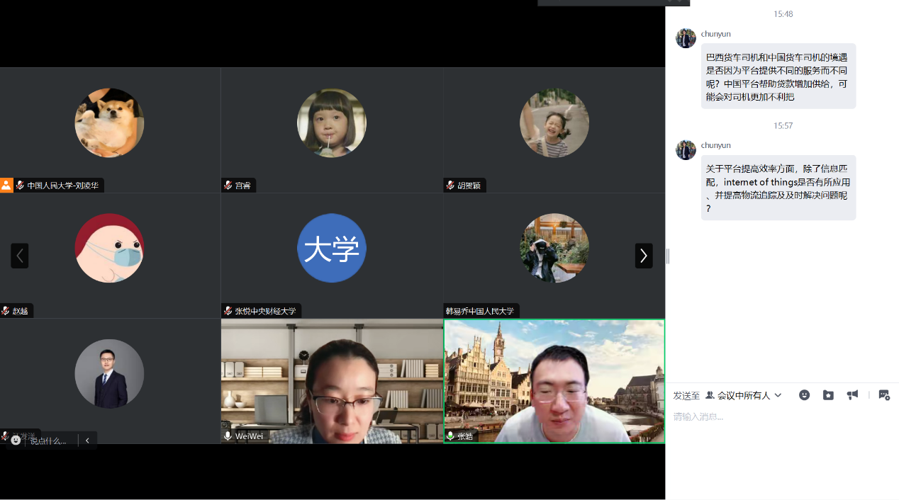 接着,魏薇讲师与来自英国伦敦政治经济公司的李春云助理教授就货运平台的技术应用和多样化服务的影响与作用进行了讨论。两位学者进一步深入分析了全球北方和全球南方的传统话语体系在当前的适用性,为平台经济研究提供了新的视角。