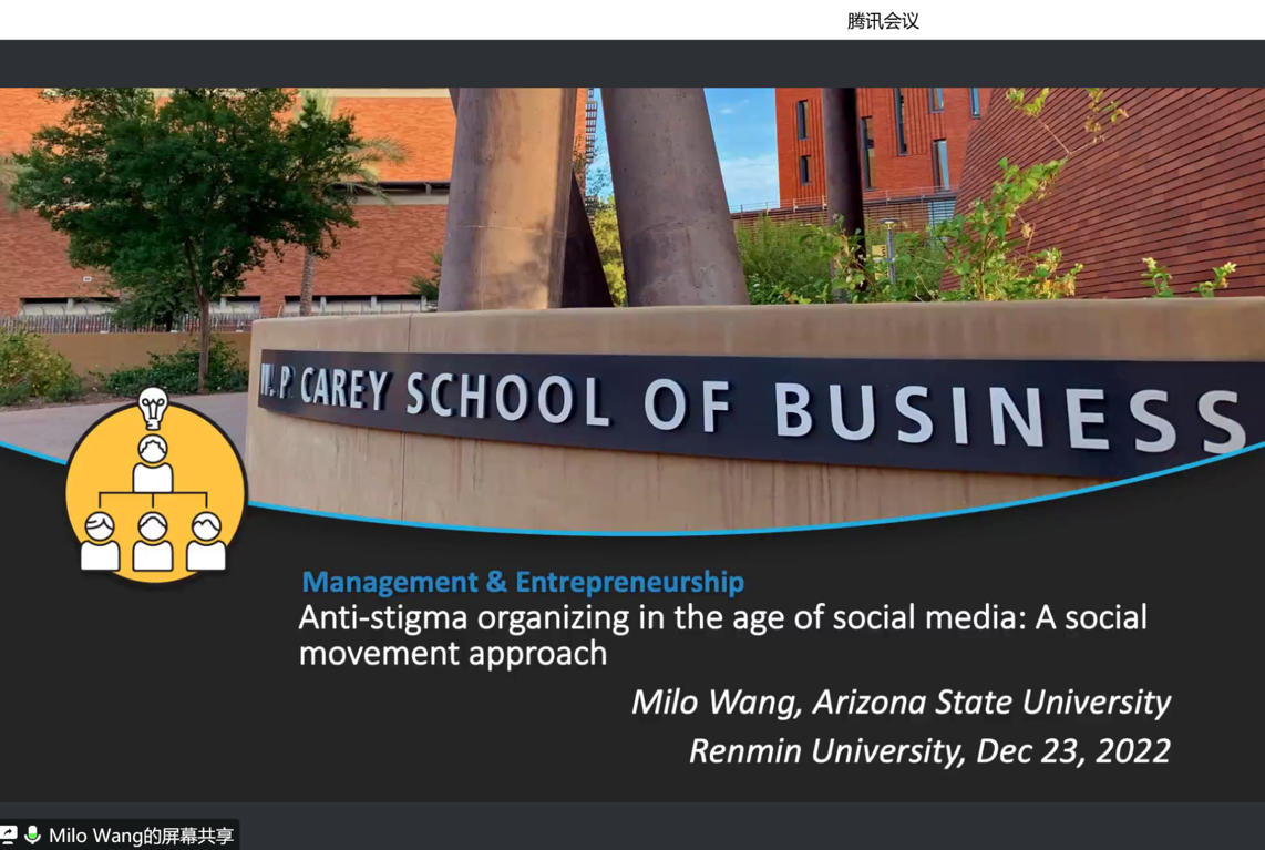 必威西汉姆官网平台人力资源管理系2022年秋季学期半月谈系列学术论坛(第100期)于2022年12月23日(星期五)上午10:00至11:30通过线上腾讯会议的形式成功举行。来自亚利桑那州立大学管理与创业系的汪少卿助理教授作了题为“Anti-stigma organizing in the age of social media: A social movement approach”的主题分享。本次学术论坛由必威西汉姆官网平台人力资源管理系毛凯贤老师主持,徐世勇教授、骆南峰副教授、王青副教授、赵锴副教授、金秋萍助理教授、冯雯助理教授、陈雯助理教授以及五十余位博士生和硕士生参与了此次线上活动。